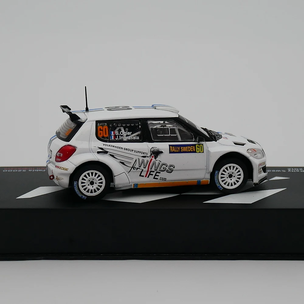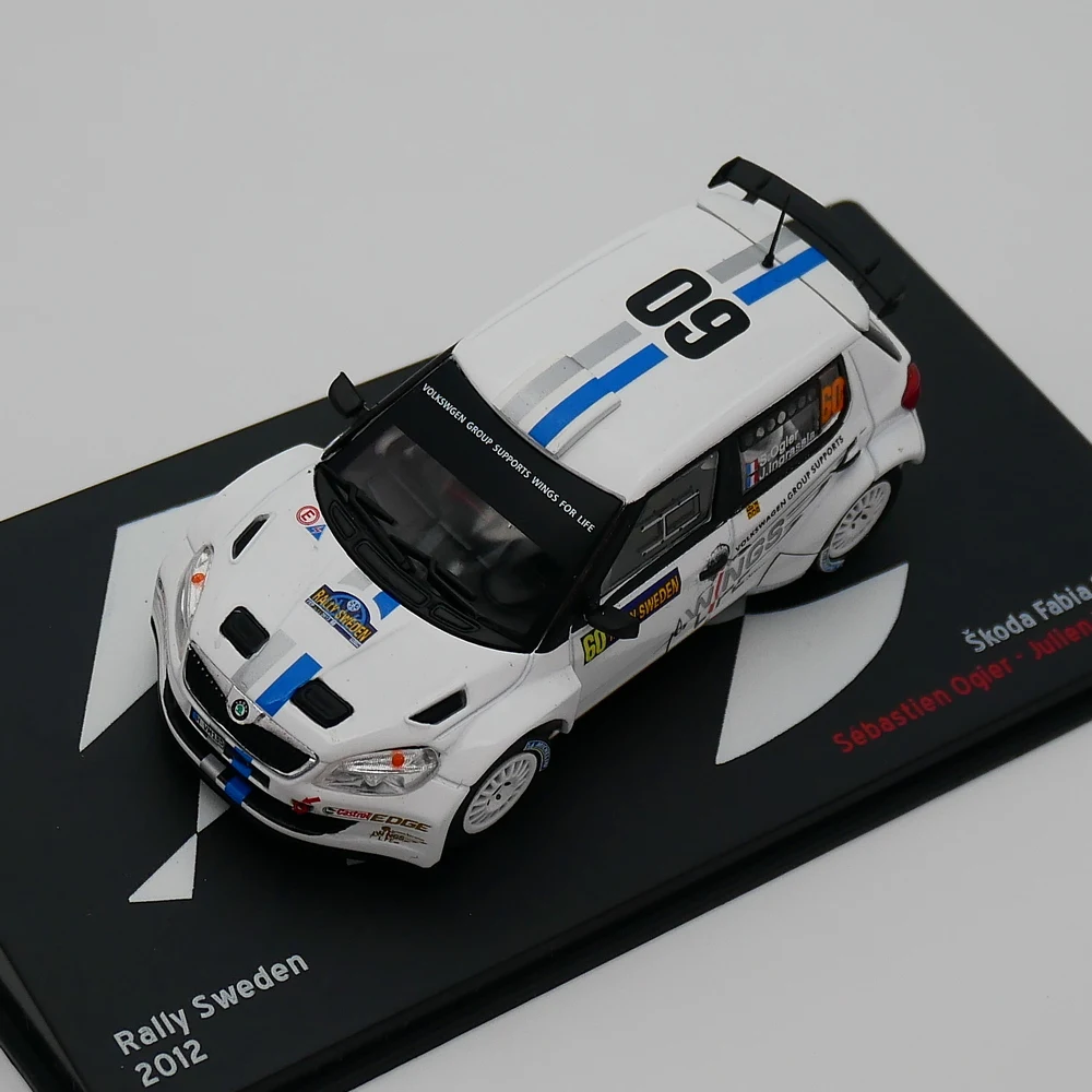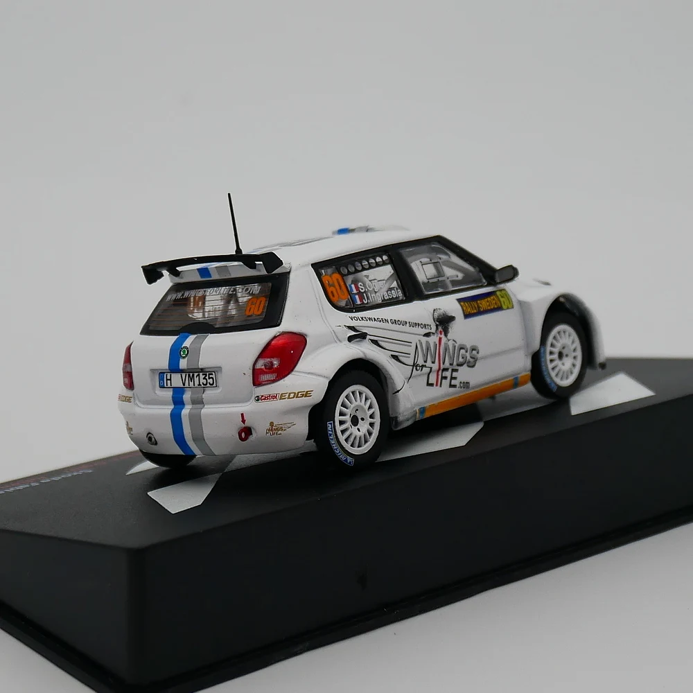 Experience the thrill of rally racing with this highly detailed 1:43 scale diecast model of the Skoda Fabia S2000 WRC2012. Crafted from alloys and plastics, this collectible captures every intricate detail of the iconic rally car. The vehicle is finished in a crisp, glossy white hue designated as “01,” with vibrant decals and branding in black, blue, orange, and gray, creating a lively and dynamic appearance. The front showcases a black grille with the Skoda emblem and clear headlights with internal detailing, while black accents around the hood vents and windshield add contrast. The sides are decorated with colorful sponsor decals, and the transparent windows reveal a simulated racing interior with seats and a steering wheel. The black rear spoiler and antenna further enhance its sporty silhouette. Featuring white wheels with detailed tires and slightly flared wheel arches, this model provides an authentic rally aesthetic, ideal for display on a shelf or desk.