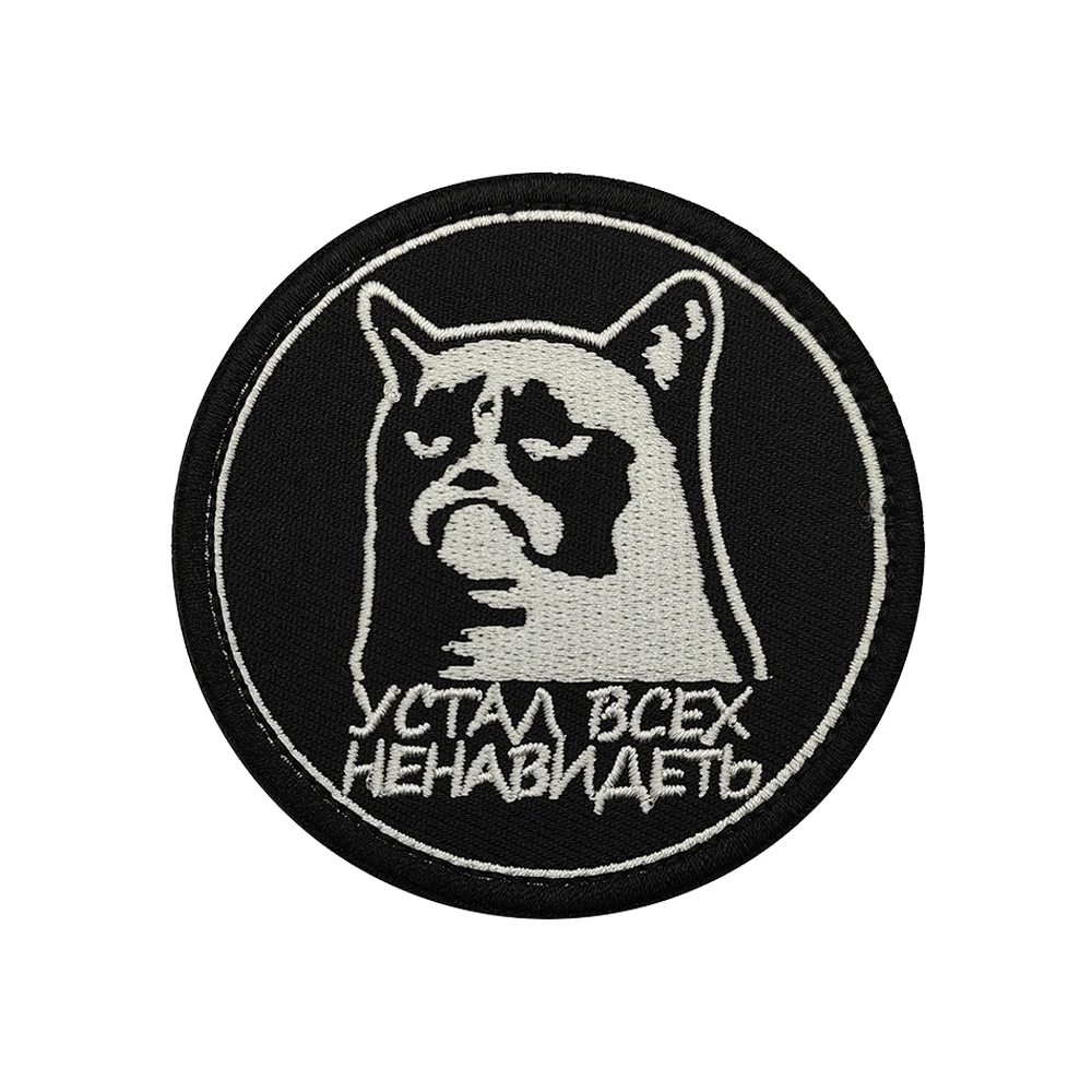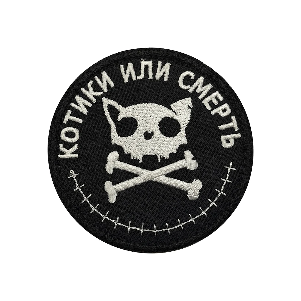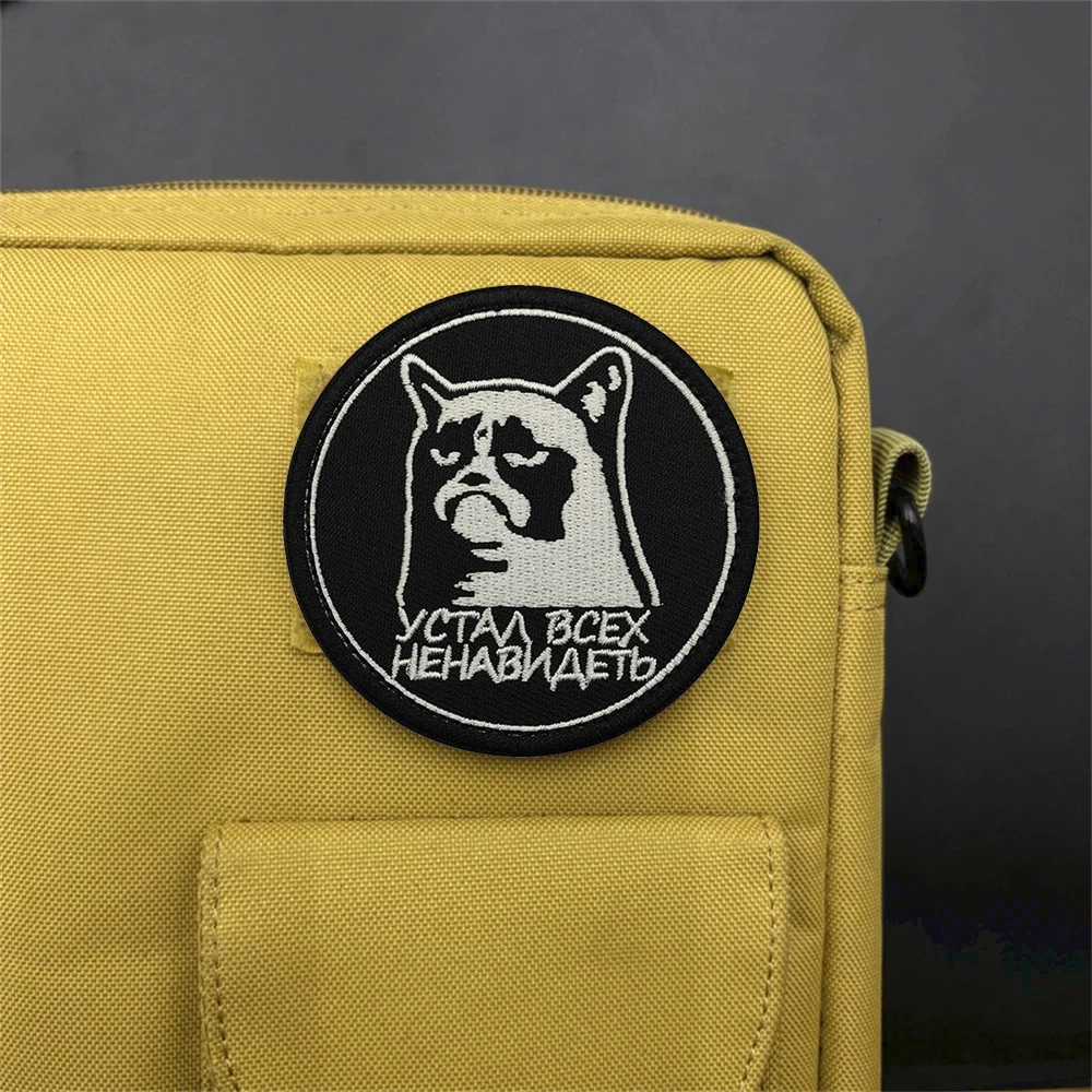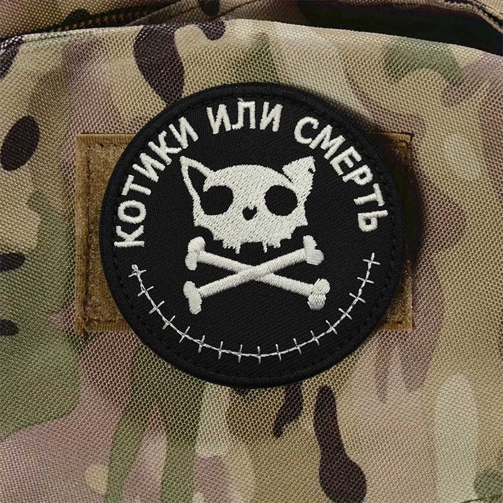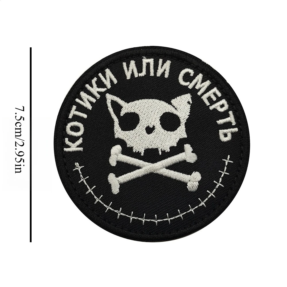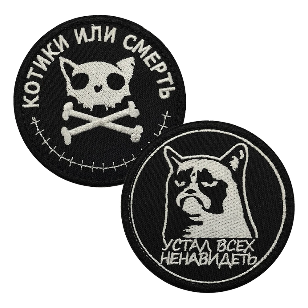 This set of two circular embroidered patches features bold designs on a solid black background, perfect for personalizing your jackets, backpacks, hats, and more. The first patch depicts a cat skull with crossbones and light grey embroidery, accompanied by the Cyrillic phrase “КOTИКИ ИЛИ СМЕРТЬ.” The second patch features a grumpy cat illustration bordered by Cyrillic text “УСТАЛ ВСЕХ НЕНАВИДЕТЬ.” Made from a durable nylon and polyester blend, these patches have a hook and loop backing for easy attachment. Size may vary by 1-3mm as shown in the listing. Available in two styles for a unique touch.