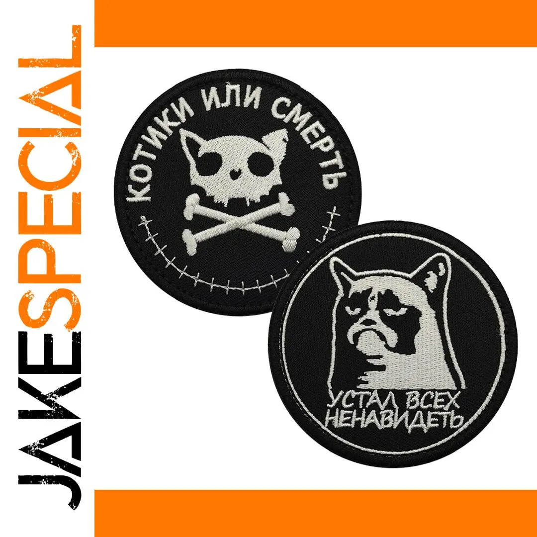 Elevate your style with this unique embroidered patch that combines edgy aesthetics with meaningful phrases in Cyrillic. The first patch depicts a skull resembling a cat, beautifully framed by a crossbones motif and accented by light grey embroidery. Its bold statement “КOTИКИ ИЛИ СМЕРТЬ” translates to “Kittens or Death.” The second patch features a stylized grumpy cat illustration, enveloped in a circular border, complemented by the phrase “УСТАЛ ВСЕХ НЕНАВИДЕТЬ,” which means “Tired of Everyone’s Hate.” Perfect for jackets, backpacks, or hats, this patch makes a striking addition to any collection.