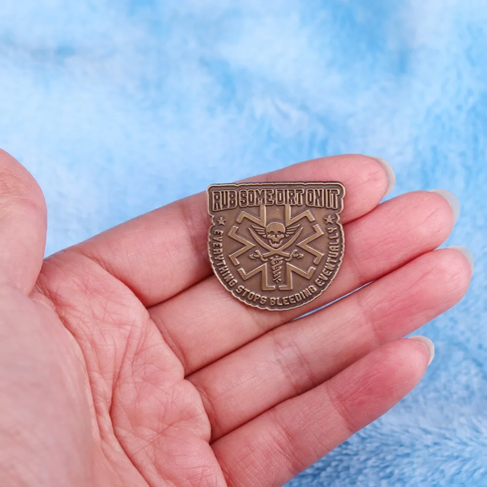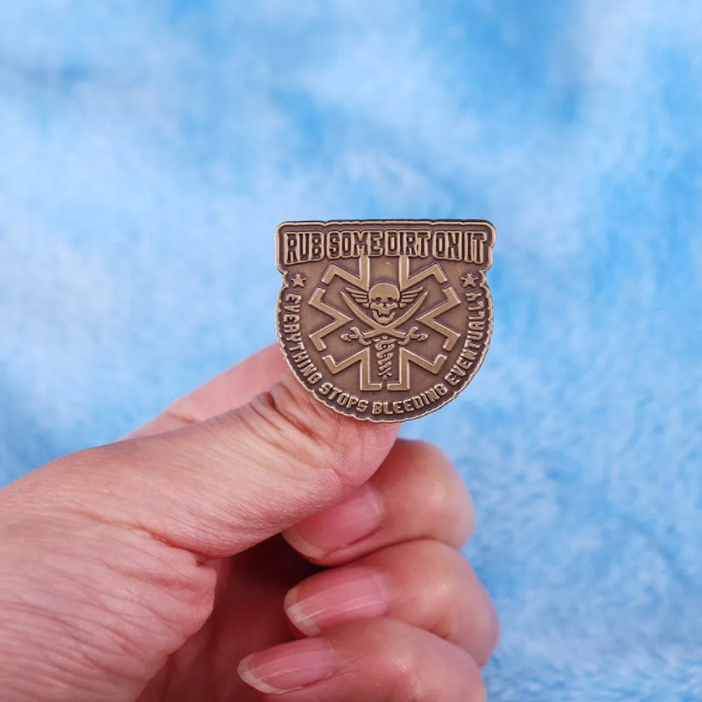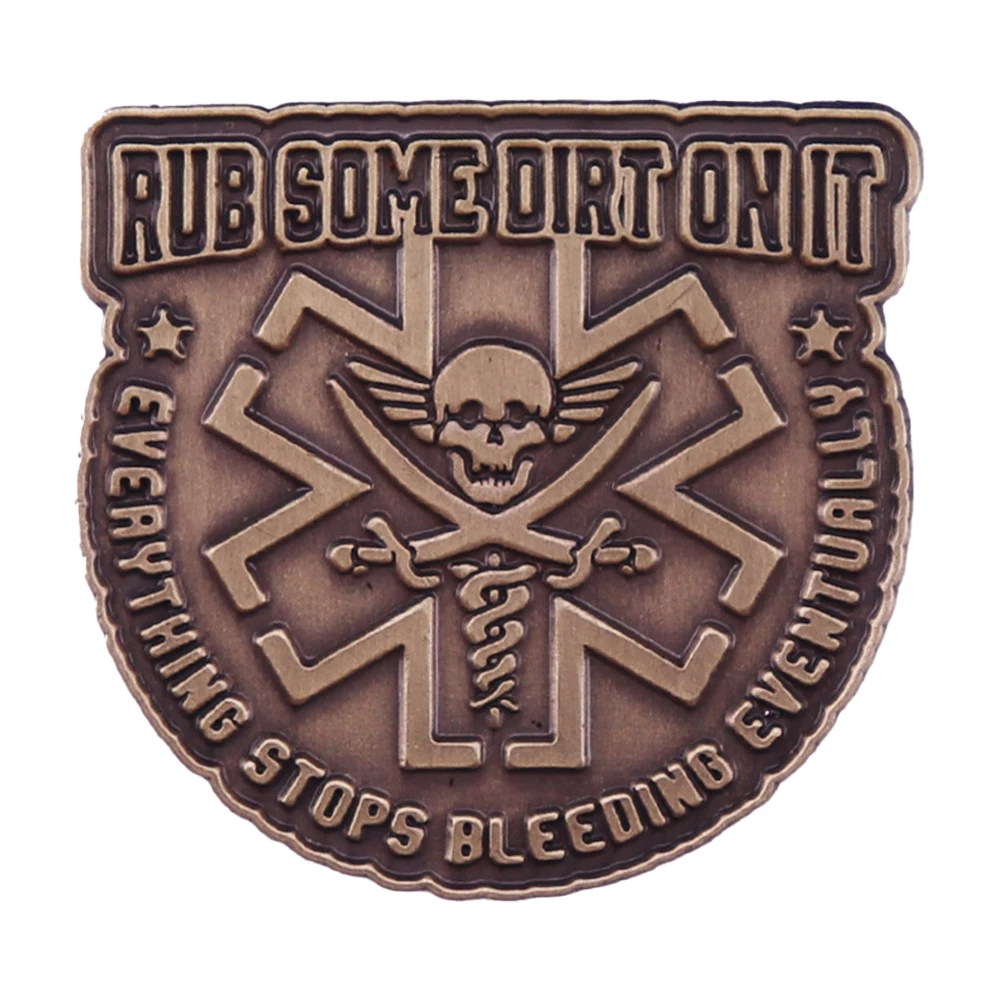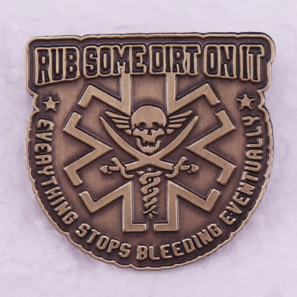 This striking enamel metal pin is your new favorite accessory, perfect for adding a rebellious flair to your outfits. Measuring approximately 3cm, its bronze color delivers a vintage aesthetic that pairs beautifully with various styles. The bold embossed text “RUB SOME DIRT ON IT” exudes attitude, while a central emblem featuring a skull with wings creates a visually impactful focus. Surrounding design elements blend punk, gothic, and hip-hop influences, making it truly unique. Ideal for jackets, backpacks, and hats, this pin empowers you to express your individual style in a versatile way.