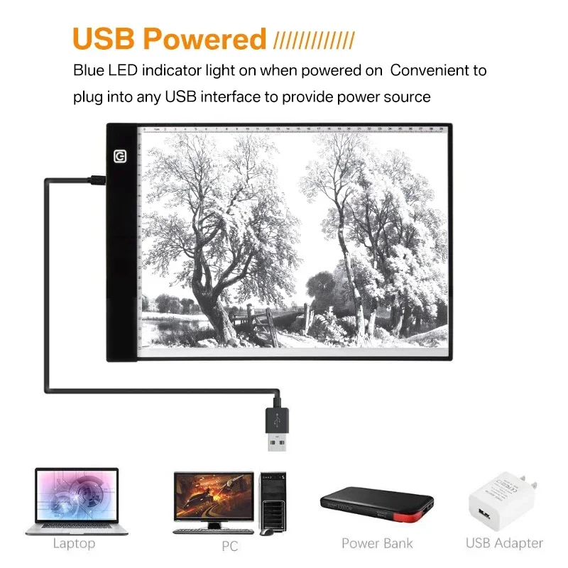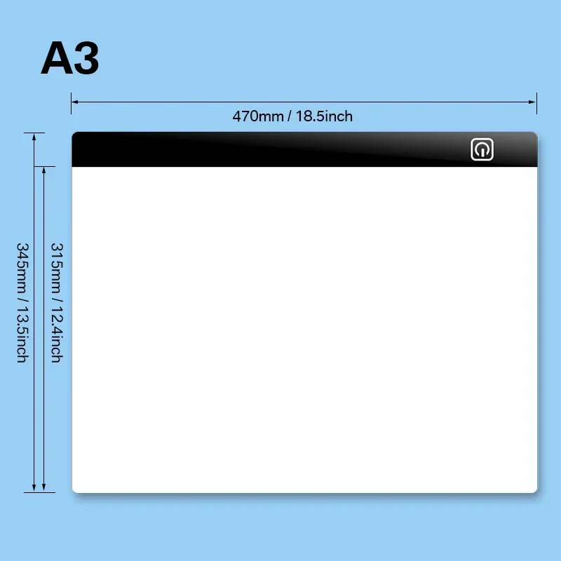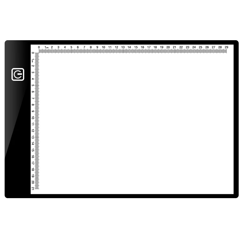 Elevate your creativity with this sleek A4 LED drawing and tracing light box, measuring 33.7 x 23.3 cm overall with a 31.1 x 23.3 cm transparent working area and just 0.4 cm thick. Crafted from acrylic, it features energy-efficient LED lighting with adjustable color temperature between 9000K and 12000K, three levels of dimming, and uniform illumination via laser light guide plate. Powered by 5V USB, this modern light box combines elegance with functionality, making it perfect for professional artists, hobbyists, and medical imaging. Its minimalist design with a clear surface and subtle black border ensures a sophisticated workspace ambiance.