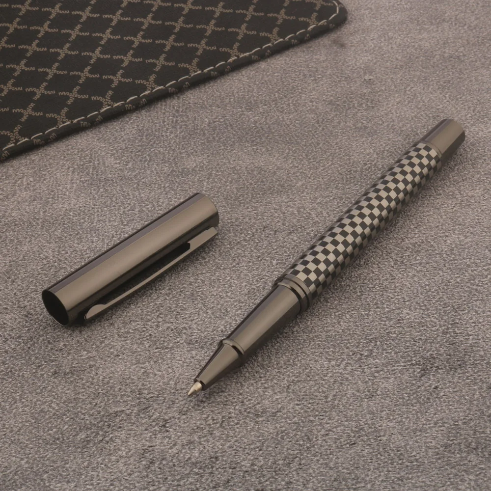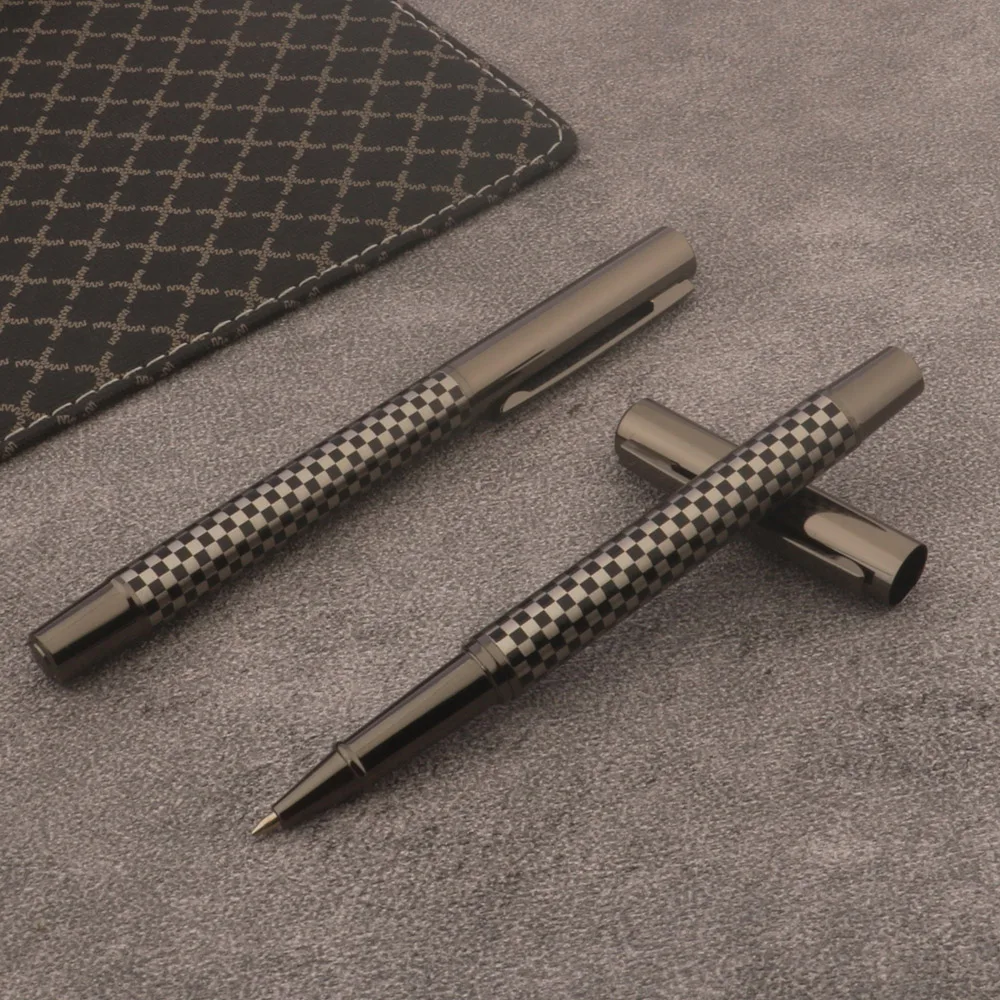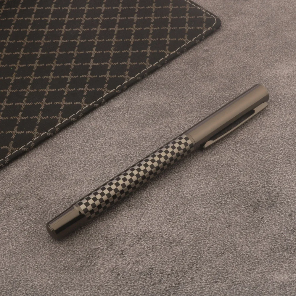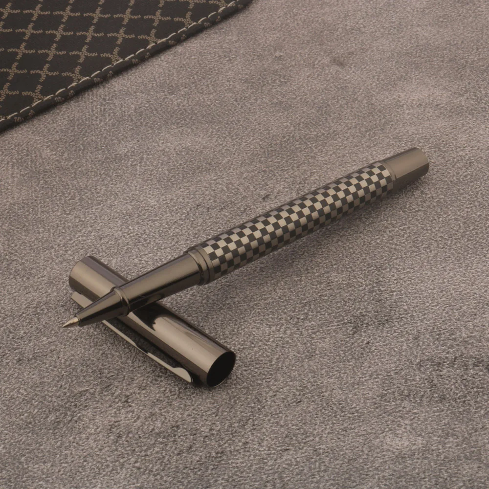 Experience the elegance and functionality of this metal rollerball pen, crafted with a sleek grey body and a modern checkered grip. The smooth, polished surface provides a durable yet sophisticated feel, perfect for professional or personal use. The pen’s slim, cylindrical shape offers a comfortable grip, while the integrated metallic clip ensures easy attachment to notebooks or pockets. With a precise 0.5mm tip and black ink, this pen delivers clean, sharp lines ideal for detailed writing tasks. Its minimalist design combines durability with an aesthetic that complements any office or school environment. Packaged securely in a bag, it's ready to add a touch of class to your daily writing. Elevate your stationery collection with this elegant and reliable pen.