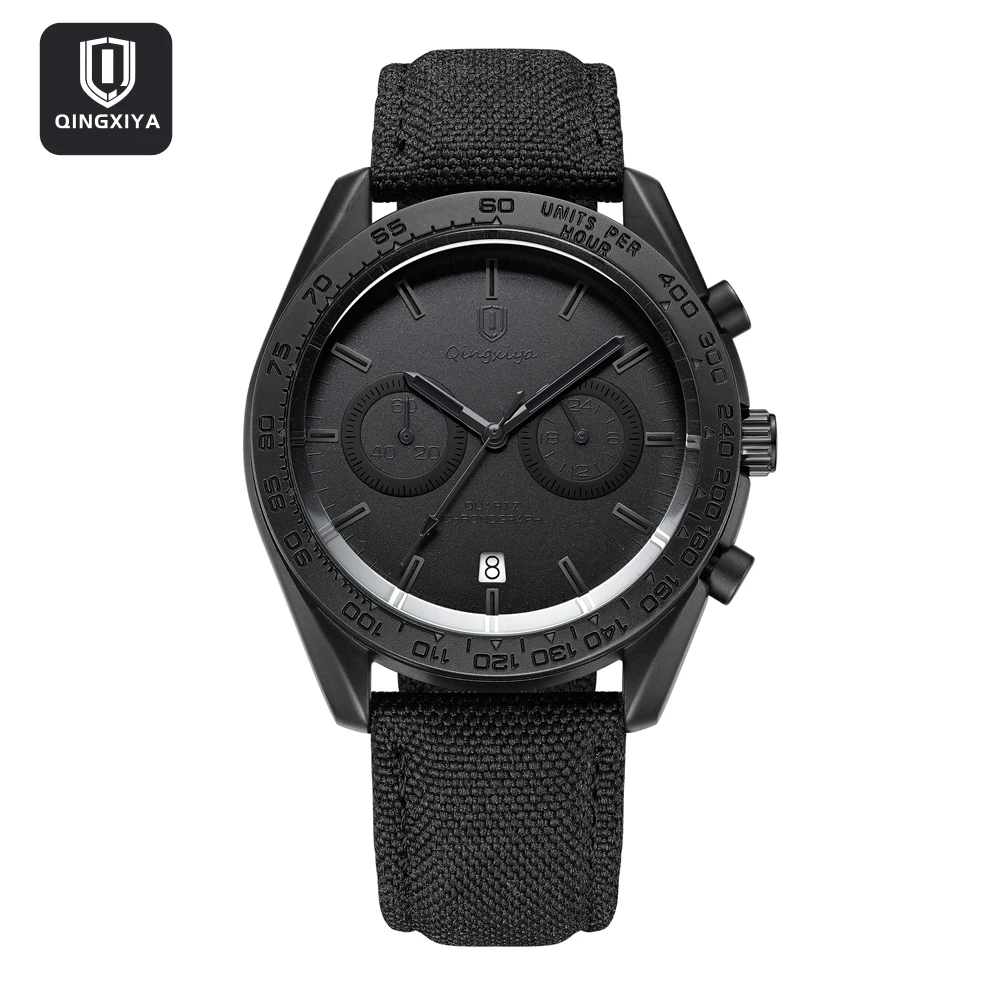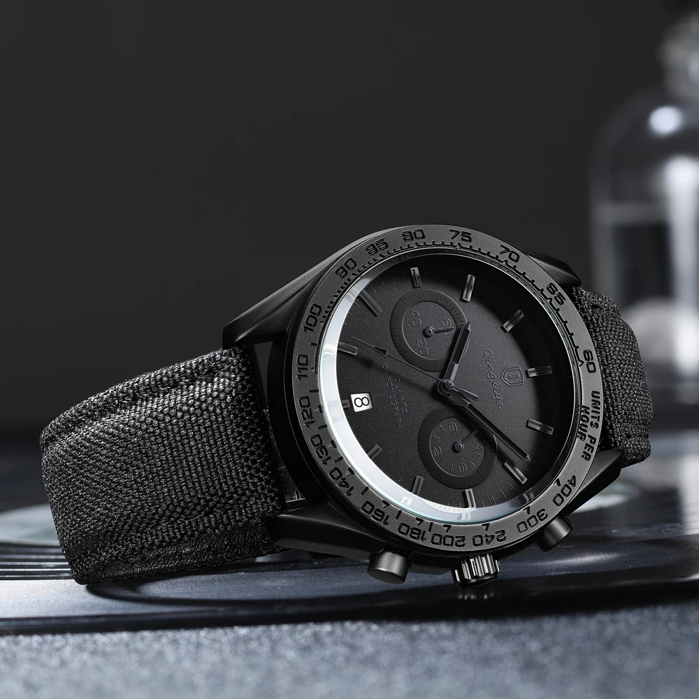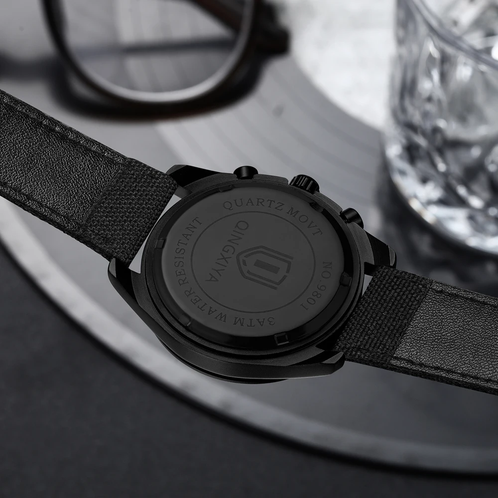 Elevate your style with this multifunctional men’s watch featuring a sleek round alloy case in matte black, with a diameter of 43mm and a thickness of 13mm. Equipped with a precise quartz movement, it showcases a stunning numberless black dial, two recessed chronograph sub-dials, and a convenient date window at 6 o’clock. The durable textured leather strap, measuring 22mm in width and 200mm in length, provides a secure fit while exuding a sporty aesthetic. With a water resistance of 3 ATM and additional functions like a complete calendar, this watch is ideal for both casual and business attire, weighing just 65g.