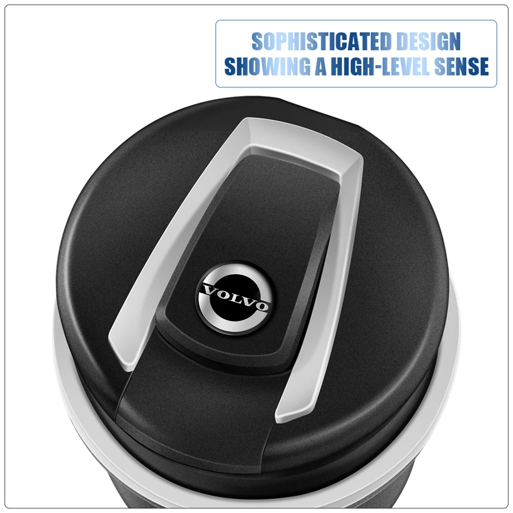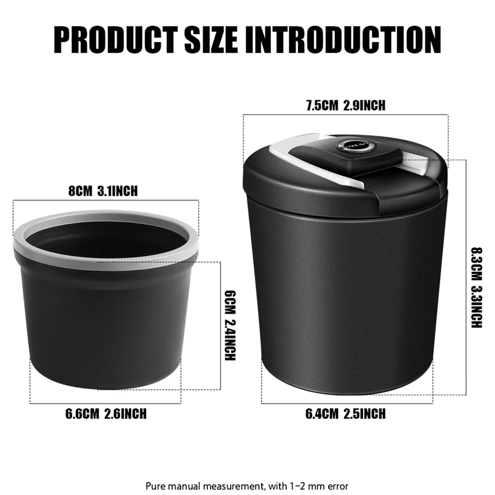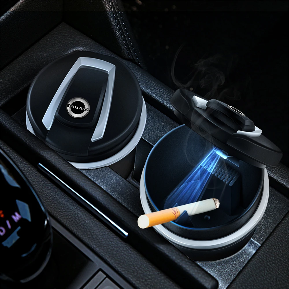 Enhance your driving experience with this sleek black portable car ashtray, crafted from high-quality steel and engineering plastics. Measuring approximately 8.6 x 6.4 cm with available sizes of 8 x 6.8 x 6.2 cm and 7.5 x 6.8 x 9.5 cm, it features a modern split design for versatile use as an ashtray and storage box. The automatic blue LED indicator adds a stylish touch, while the flame-retardant structure ensures safety by preventing smoke leakage. Compatible with a wide range of car models including R-Design, XC90, XC60, S60, S80, V70, V60, V90, D5, T6, C70, and more, making it an essential accessory for any vehicle.