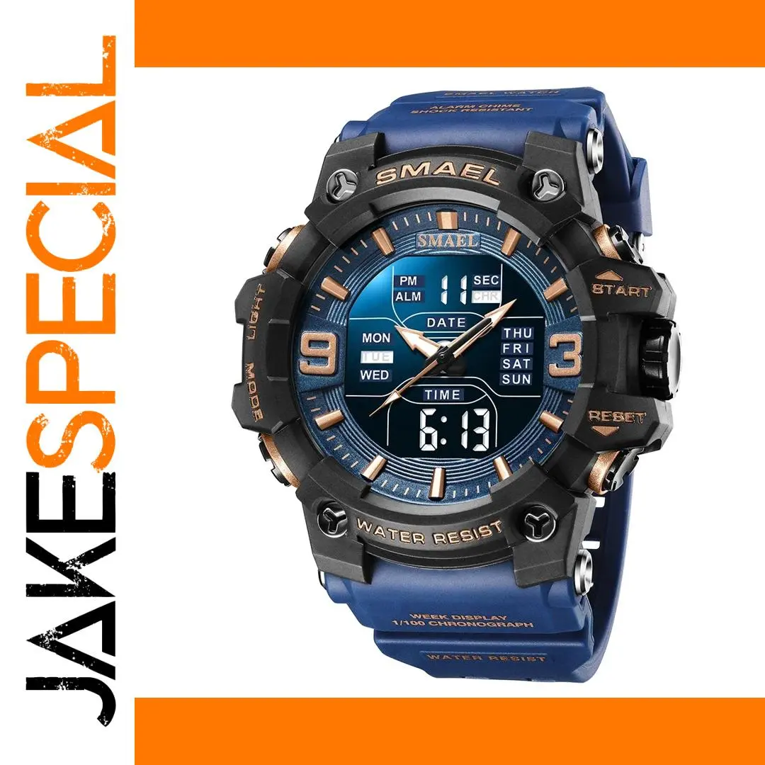 Experience the perfect blend of style and functionality with the SMAEL 8049 Waterproof Electronic Watch. Featuring a striking deep blue dial and a rugged black ABS plastic case with bronze-toned accents, this digital wristwatch is designed for both sports enthusiasts and casual users. With a 59mm dial, secure 22mm silicone strap, and water resistance up to 50 meters, it is built to withstand your adventures. Track time effortlessly with large white numeric displays, enjoy features like alarms and a stopwatch, and navigate your day with ease. Elevate your wrist game—imagine the compliments you’ll receive while rocking this multifunctional timepiece.