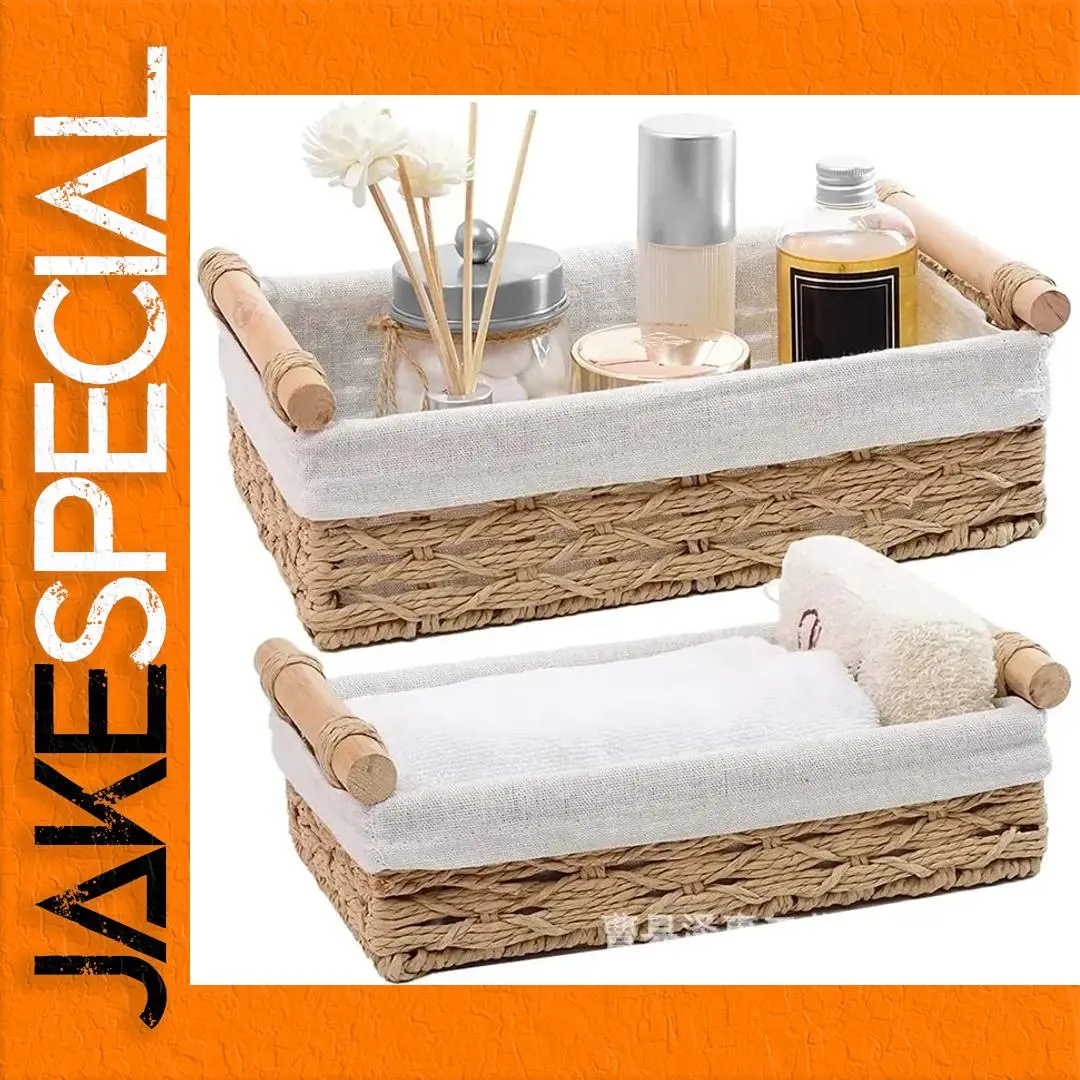 Discover the perfect blend of functionality and style with this this small wicker storage basket. Crafted from natural paper rope, it features a round, compact design that adds a rustic yet refined touch to your bathroom or kitchen countertop. Its textured woven surface captures craftsmanship and organic appeal, highlighted by a warm, light tan or beige hue. The soft linen-colored fabric lining drapes over the top edges, providing a refined contrast and gentle softness. Supported by wooden or bamboo rods, the basket is sturdy yet lightweight, making organizing your daily essentials effortless. Whether for storing toiletries, small jars, or miscellaneous accessories, this versatile basket elevates your space with its understated elegance and practical charm.