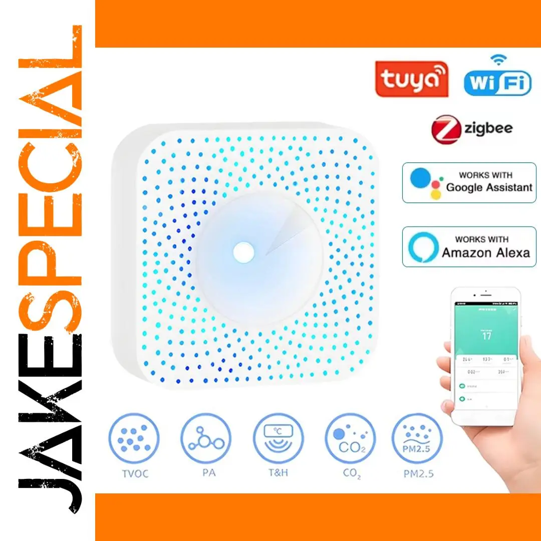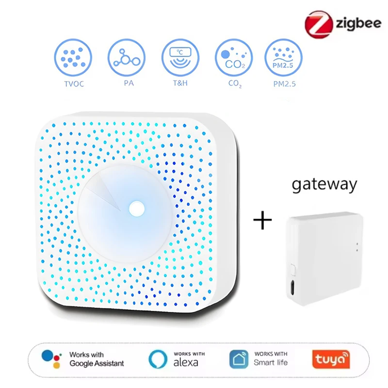 Experience smarter living with this Tuya WiFi/Zigbee 6-in-1 smart air quality monitor. Its sleek, compact white design seamlessly merges style and function, fitting into any space effortlessly. Equipped with advanced sensors, it provides real-time data on PM2.5, formaldehyde, VOCs, CO2, temperature, and humidity, ensuring your environment remains healthy and safe. The device connects via Wi-Fi or Zigbee, allowing smooth integration into your smart home system. Its minimalist look, featuring a symmetrical pattern of ventilation holes and a raised sensor-like center, complements modern décor. Whether on a desktop or wall-mounted, it offers easy setup. With app control and voice command compatibility, it makes monitoring effortless and instant, giving you peace of mind wherever you are.
