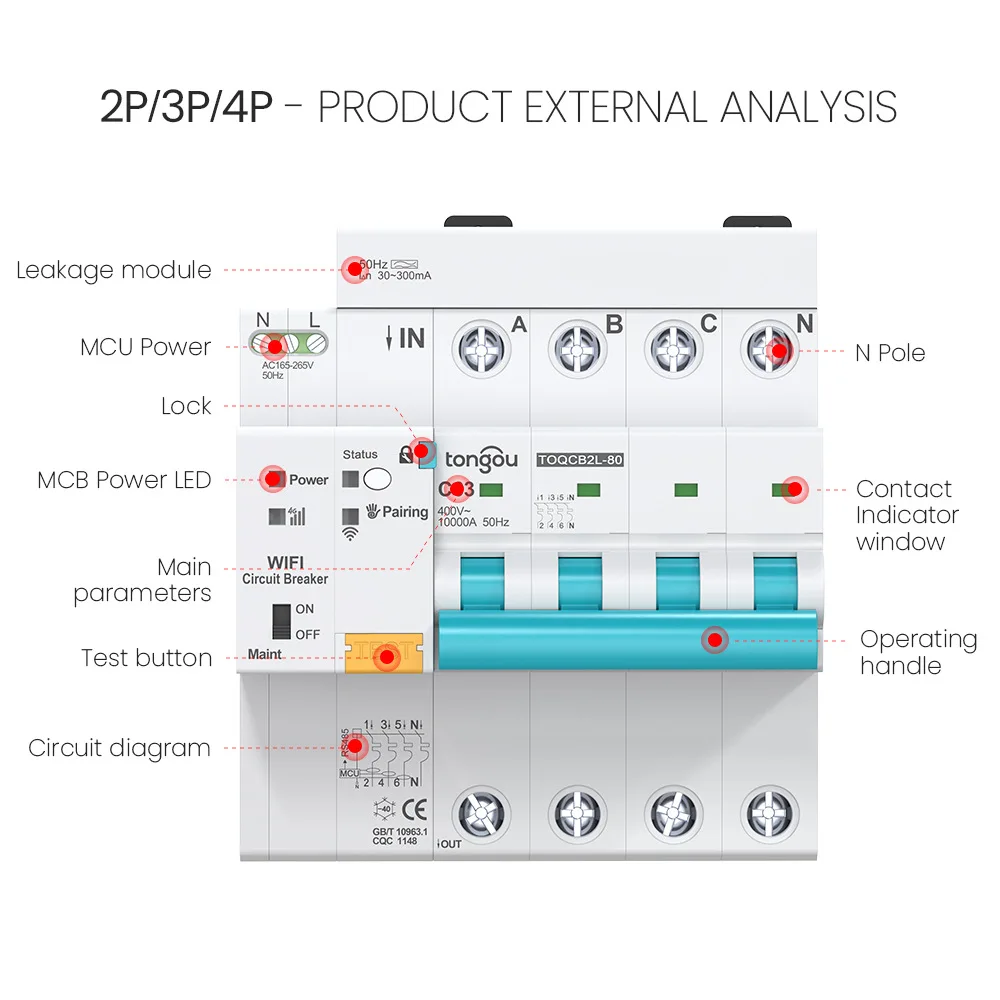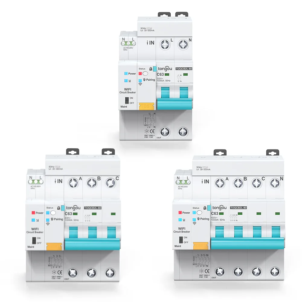Enhance your electrical safety with this modern smart miniature circuit breaker from the TOQCB2L series, available in 2P, 3P, and 4P configurations supporting 1 to 63A. Featuring Tuya app control, it allows remote monitoring and management of your circuits, ensuring optimal power usage and safety. Equipped with earth fault protection and comprehensive LED indicators, it provides real-time status updates and advanced safety features, including over-voltage, under-voltage, overload, leakage, and short-circuit protection. Its sleek, minimalist white design is both functional and stylish, making it ideal for modern electric setups that prioritize safety, efficiency, and remote control convenience.