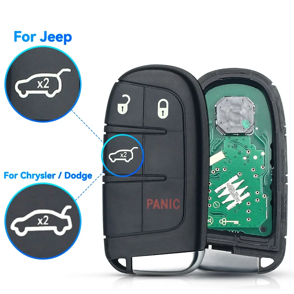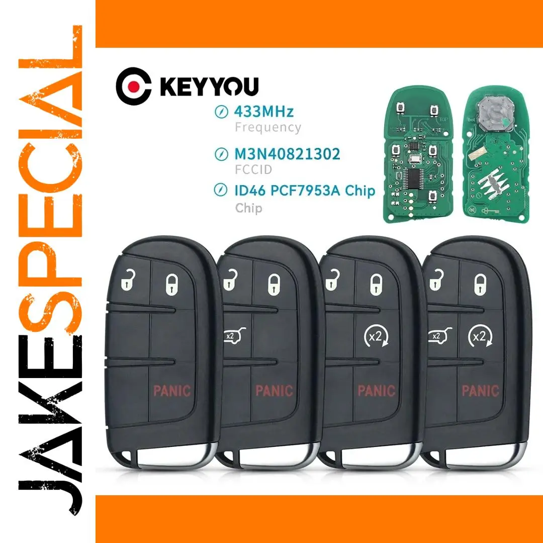 Enhance your vehicle’s security with this sleek, smart remote car key compatible with Chrysler, Dodge, and Jeep models, operating at 433MHz with an FCC ID of M3N-40821302. Measuring 7cm x 3.5cm x 1.2cm and weighing 49g, it features 3, 4, or 5 buttons—including lock, unlock, trunk release, and panic—housed in a durable black ABS casing with a textured surface for better grip. Contains a key blank, circuit board, battery, and ID46 chip (PCF7953). Compatible with Dodge Journey (2011–2018), Charger (2011–2018), Dart (2013–2016), Challenger (2015–2018), Durango (2014–2019), Chrysler 300C (2011–2017), and Jeep Grand Cherokee (2014–2019). Proper programming and blade cutting are required prior to use.