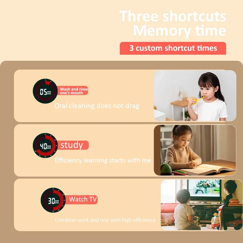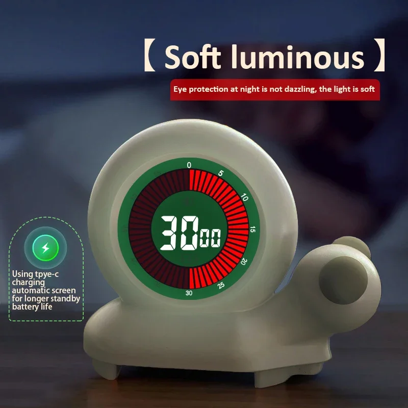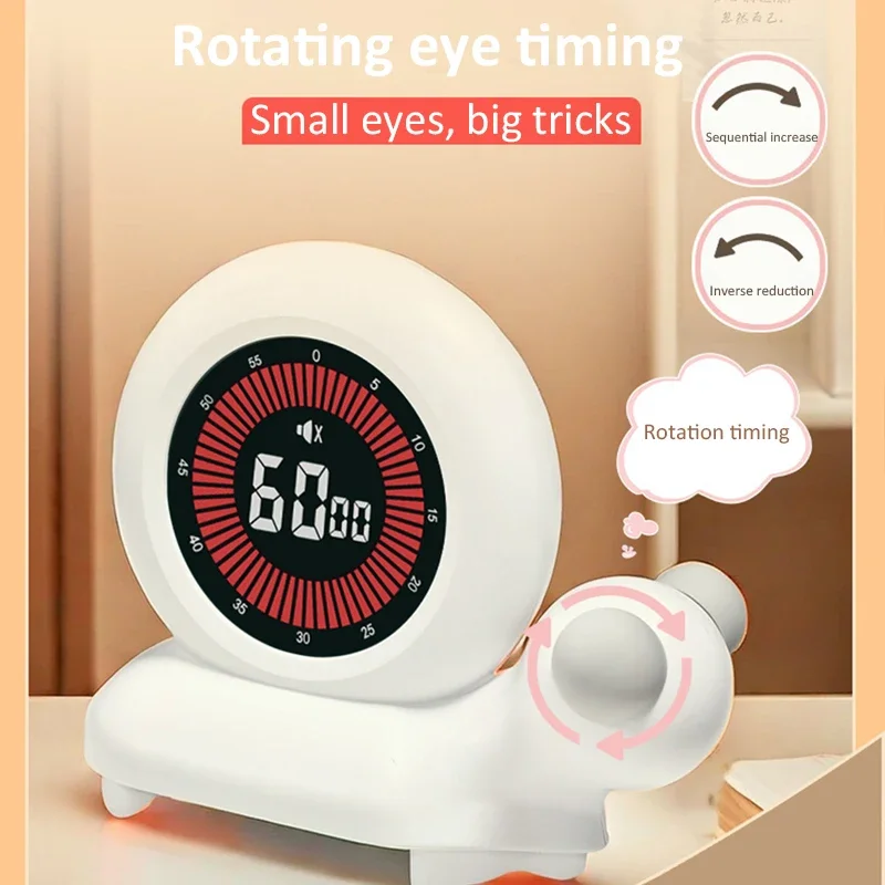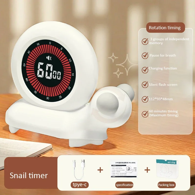 Experience streamlined time management with this sleek, white rotary timer. Featuring a 60-minute countdown, it’s equipped with an easy-to-use dial for clockwise or counterclockwise adjustment, three customizable memory shortcuts, and a silent, visual LED display that gradually diminishes as time passes. The gentle, diffused night light offers eye-friendly illumination, perfect for nighttime use in study, kitchen, or shower environments. Made from durable ABS plastic and weighing just 95 grams, this rechargeable timer charges via Type-C cable and automatically enters standby mode after 10 seconds of inactivity. Its modern, snail-shaped design combines minimalism with functionality, making timing both effortless and elegant.
