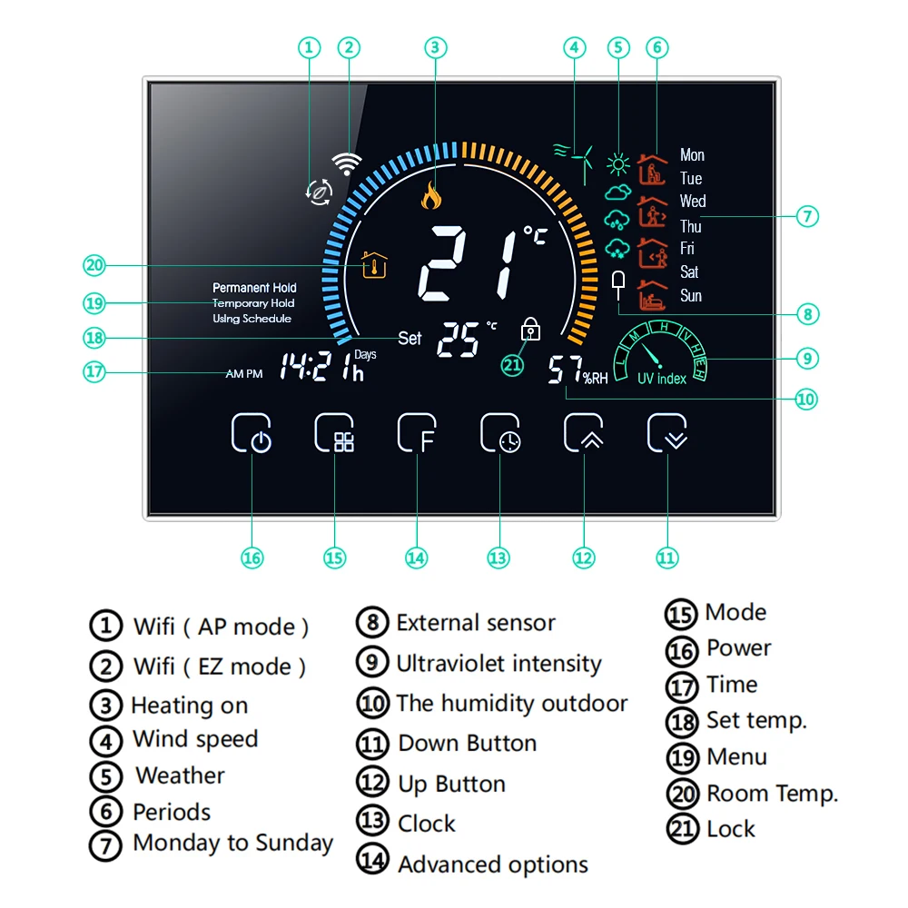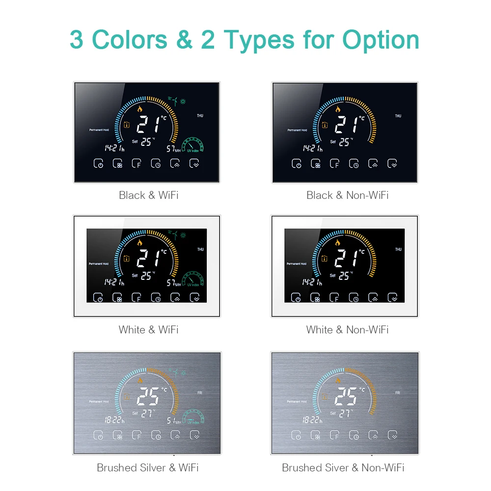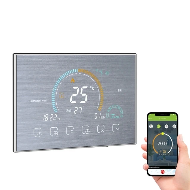 Experience the seamless blend of style and technology with this Smart WiFi Thermostat, designed for ultimate home comfort. Its chic 4.8-inch color LCD touch screen prominently showcases the current temperature at “21°C,” desired temperature “25°C,” and current humidity level at “57%,” all in vivid colors. The brushed stainless steel finish elevates any modern home decor. With smart WiFi capabilities, control your heating remotely, ensuring comfort at your fingertips. The intuitive interface features programmable options for tailored heating and includes atmospheric indicators like UV readings. Invest in a thermostat that simplifies your life and enhances your living environment.