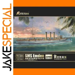 Step into history with this stunning 1:700 scale plastic model kit of the German Navy cruiser SMS Emden by Flyhawk. Featuring a vibrant, detailed illustration on the box, you can imagine sailing this iconic ship across lively ocean waves under a striking sunset or sunrise sky painted in shades of pink, orange, and purple. The artwork also captures lush green palm trees and festive signal flags, evoking a tropical coastal atmosphere. This limited edition kit allows you to craft a highly accurate replica, with precision parts to assemble a classic early 20th-century warship, complete with intricate deck structures, three tall smokestacks, and a sleek hull. Perfect for collectors and model enthusiasts alike, it’s a rewarding project for those passionate about historical naval ships.