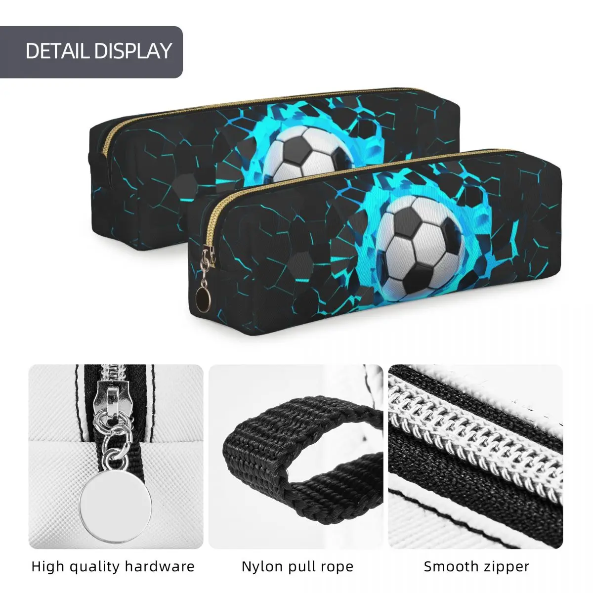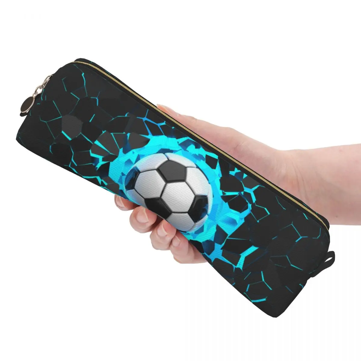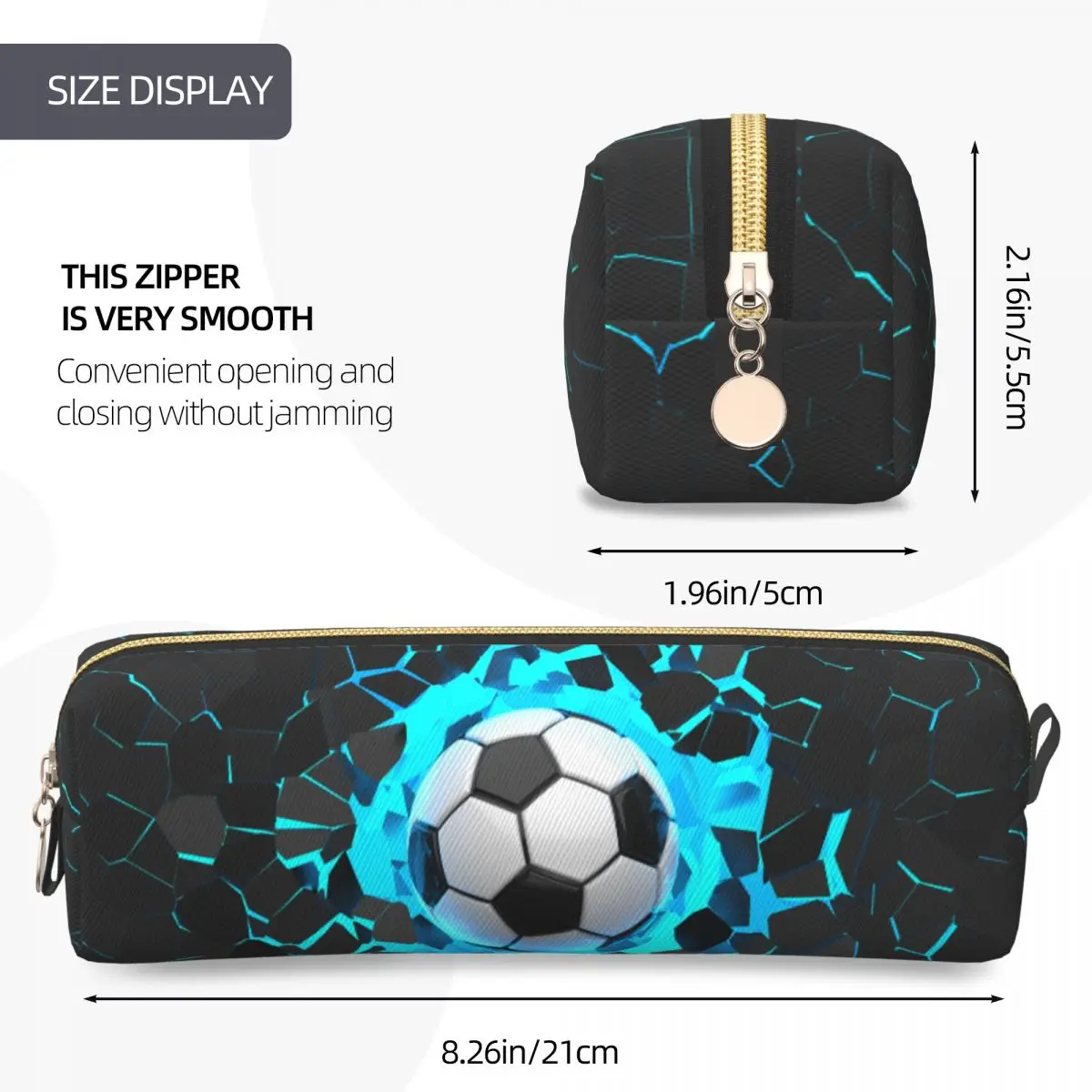 Transform your stationery collection with this vibrant soccer ball-themed pencil case. Crafted from a durable leather-like material, this practical holder combines functionality with a sporty aesthetic. The case features an elongated rectangular design, showcasing an eye-catching graphic of a classic black and white soccer ball exploding through a dynamic blue background. The spacious interior accommodates various school supplies, making it ideal for students and sports enthusiasts alike. With a stylish metallic gold zipper and a smooth zipper pull, this pencil case not only looks great but is also built for everyday use.
