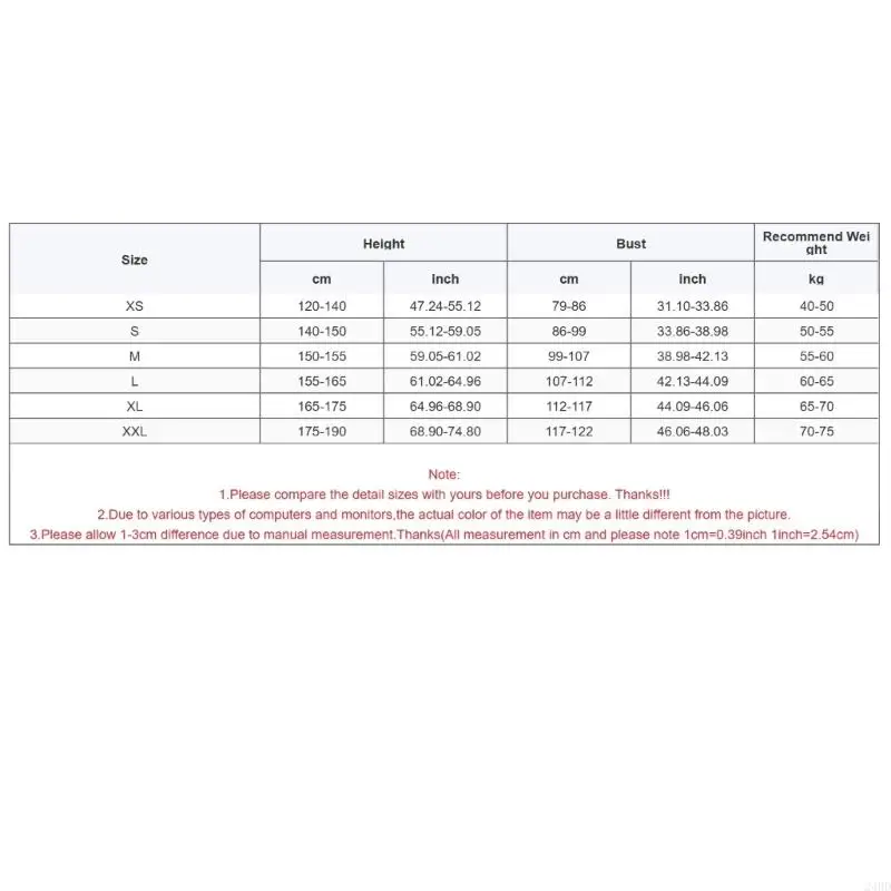 - Available in sizes XS to XXL, fitting heights from 120cm to 190cm, with adjustable bust measurements for a personalized fit.