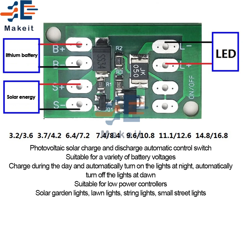 Experience seamless solar power management with this innovative circuit board designed for DIY enthusiasts. Its sleek green rectangular design with rounded edges offers a professional appearance, featuring white silk-screened labels for easy wiring. This control board automatically switches lights on at night and off at dawn by detecting voltage changes from your solar panel, eliminating the need for photosensitive components. Built to handle a maximum output current of 600mA, it’s compatible with protected lithium batteries and mobile phone batteries with 3.7V. The circuit is suitable for LED loads of 2V or 3V, requiring step-down converters or resistors. Compact yet powerful, this circuit board streamlines your solar projects, ensuring reliable performance and easy installation for optimal energy efficiency.