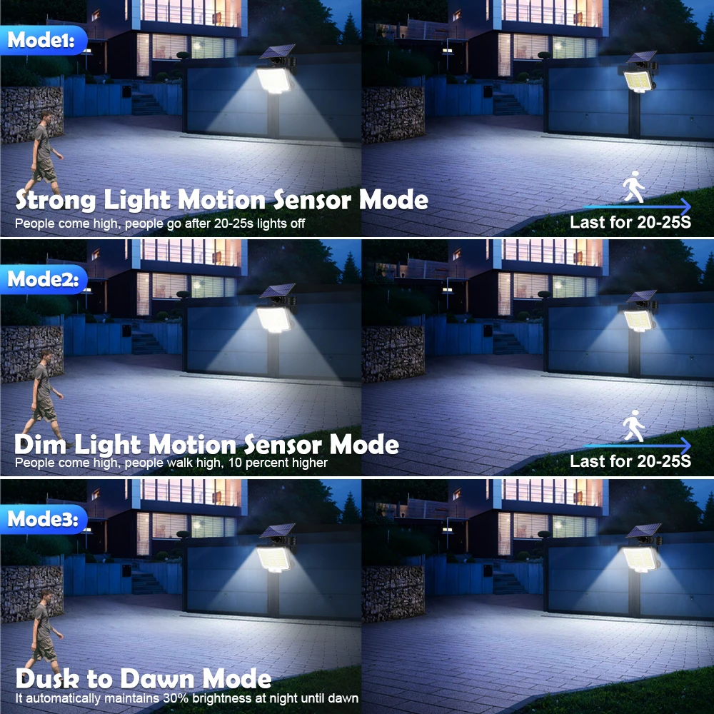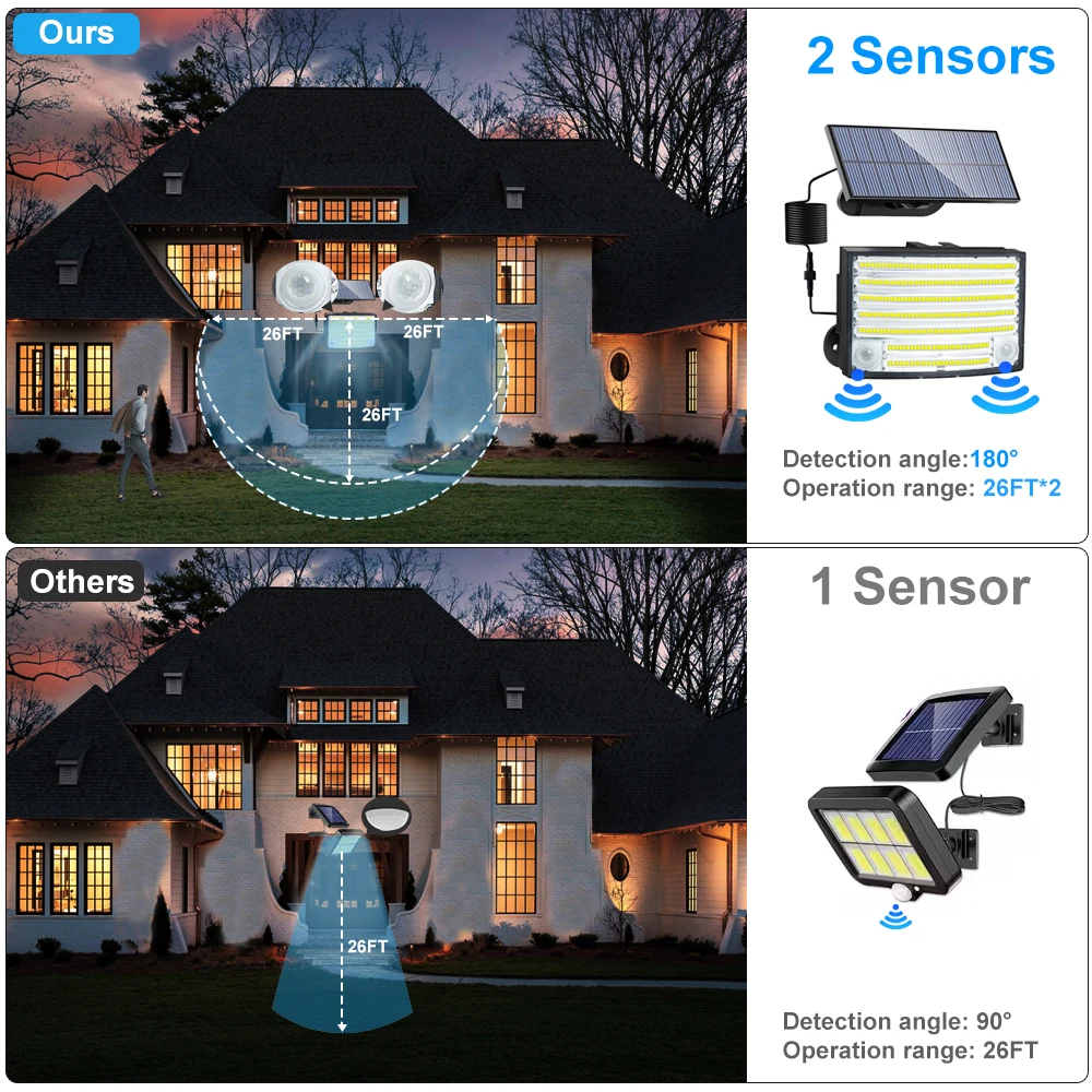 Experience powerful outdoor illumination with these solar-powered floodlights available in three models: 200 LEDs with a luminous angle of 180° and a lighting distance of 8-10 meters; 210 LEDs featuring 2835/0.2W beads, covering 30 square meters, with adjustable pivot angles up to 120° and detection ranges up to 80 feet at 180° and 270° angles; and 288 LEDs with 21% conversion efficiency, covering a wide area with a 270° illumination angle and a detection distance of up to 32 feet. Each model operates at 5.5V with an output power of 1.5W, powered by an 18650 lithium battery capacity of 1800mAh, and is rated IP65 for waterproof performance. Their adjustable solar panels optimize sunlight exposure, providing reliable, eco-friendly security and outdoor lighting.