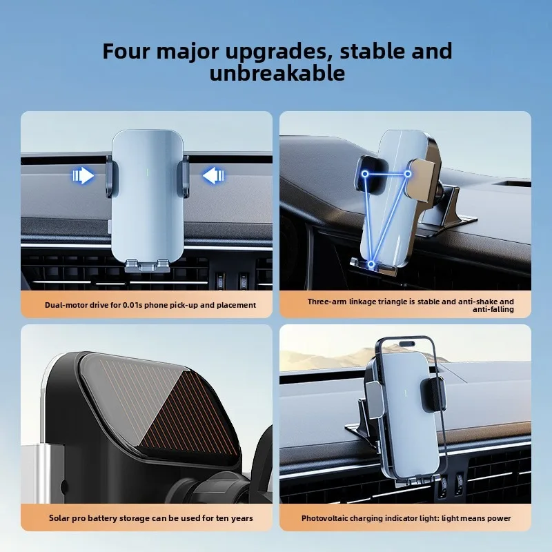 Experience the perfect blend of modern style and functionality with this solar power car phone holder. Its sleek, silver metallic finish and minimalist design add sophistication to your vehicle’s interior. Crafted from premium metal, ABS plastic, and silicone, it combines durability with lightweight portability. Its vertical, elongated shape ensures a snug fit for your smartphone, secured by soft silicone pads that prevent slipping and scratching. Integrated electronic components accommodate wireless charging and automatic clamping, making your driving safer and more convenient. The device’s foldable structure allows easy storage and deployment, while the electric tightening guarantees a stable hold even on bumpy roads. Designed for a sleek appearance and reliable performance, it’s the ideal tech upgrade for your car’s dashboard setup.