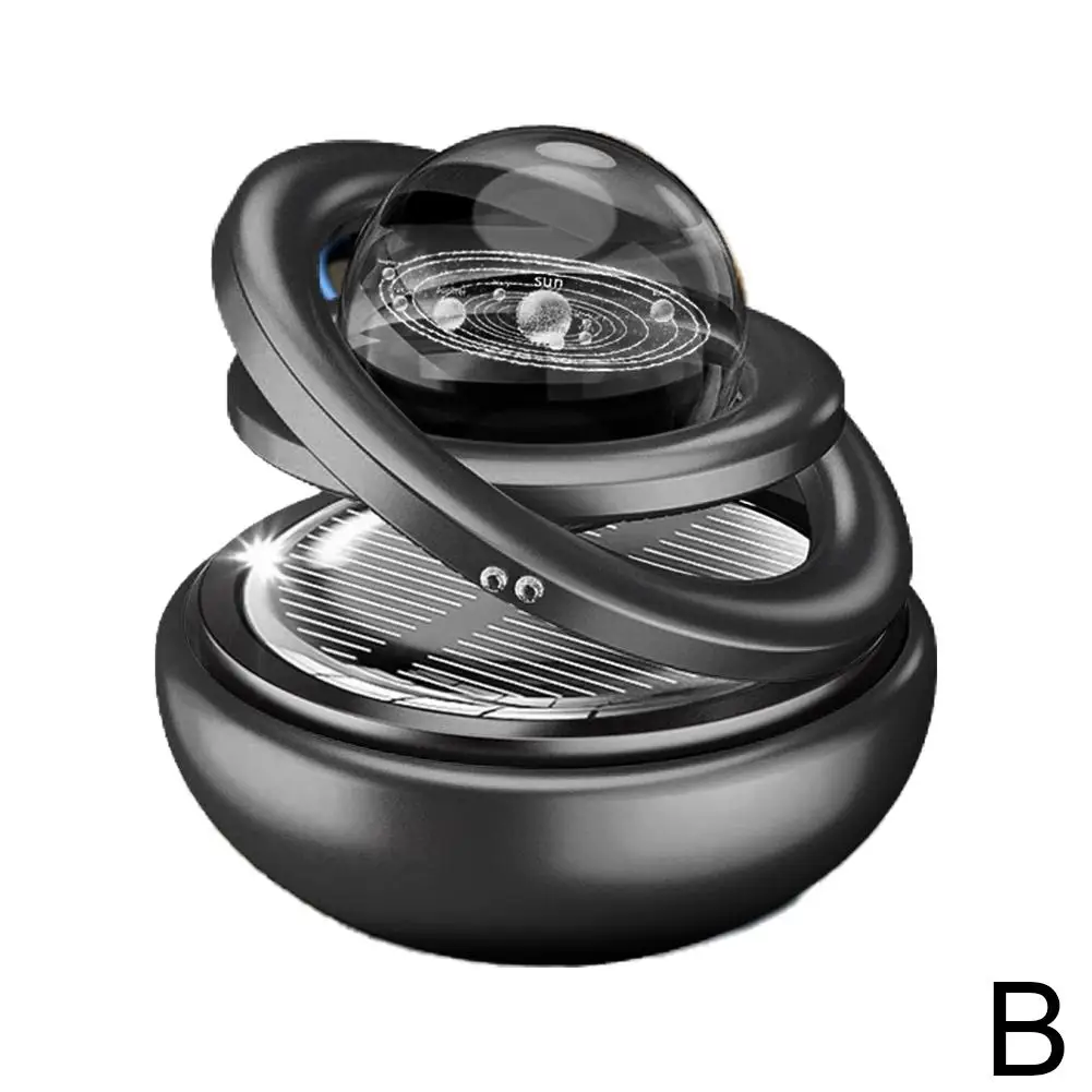 Experience a modern touch of elegance with this solar-powered rotating aromatherapy diffuser, available in vibrant red, black, gold, or silver. Its sleek, spherical design features a transparent dome protecting the internal rotating mechanism, powered solely by sunlight through a solar sensor circuit board. The device gently rotates a pendulum to disperse pleasant fragrances, effectively purifying the air and eliminating odors in your car, home, or office. Compact and decorative, it encompasses compressed fragrant tablets and operates without electrical components, making it an eco-friendly choice. Enhance your environment with this charming, functional ornament that combines aesthetic appeal and air freshness effortlessly.