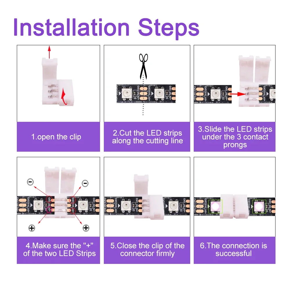 - Simple to install—just slide the LED strip into the connector and close the clasp—no soldering or tools needed, making DIY installations quick and easy for any user.