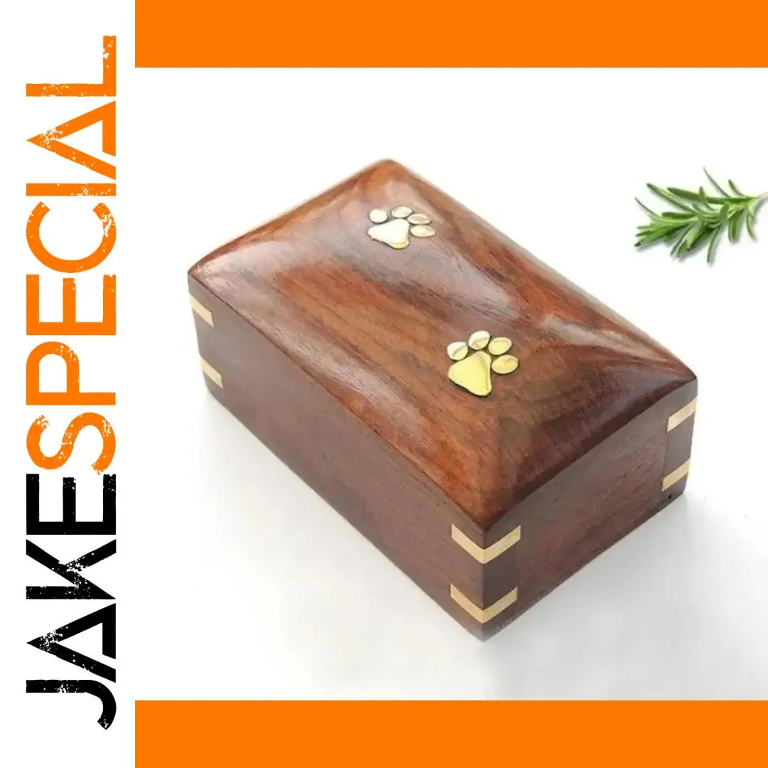 Experience a peaceful farewell with this beautifully crafted solid wood pet urn, measuring 12.7 cm by 7.6 cm by 6.5 cm. Made from natural bamboo, it boasts a warm, rich brown color with eye-catching wood grain patterns that emphasize its organic nature. The gently arched top surface adds a soft, inviting touch, complemented by neatly beveled edges and reinforced corners with light-colored inlays, showcasing fine craftsmanship. Decorated with two delicate paw print motifs, one larger and one smaller, positioned at the top center, it beautifully symbolizes your pet’s footprints in a heartfelt memorial. This high-quality cremation urn reflects dignity, respect, and natural beauty—an ideal keepsake for honoring your small pet’s memory.