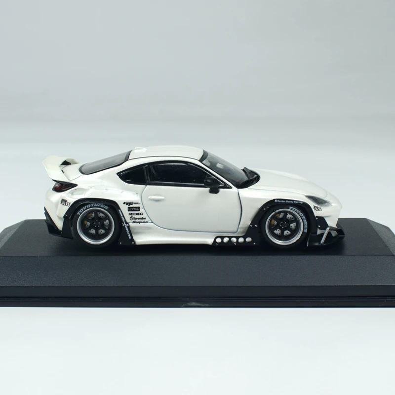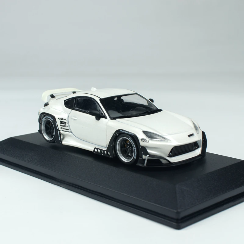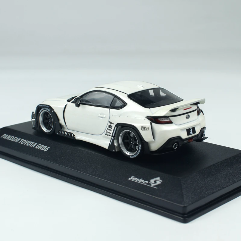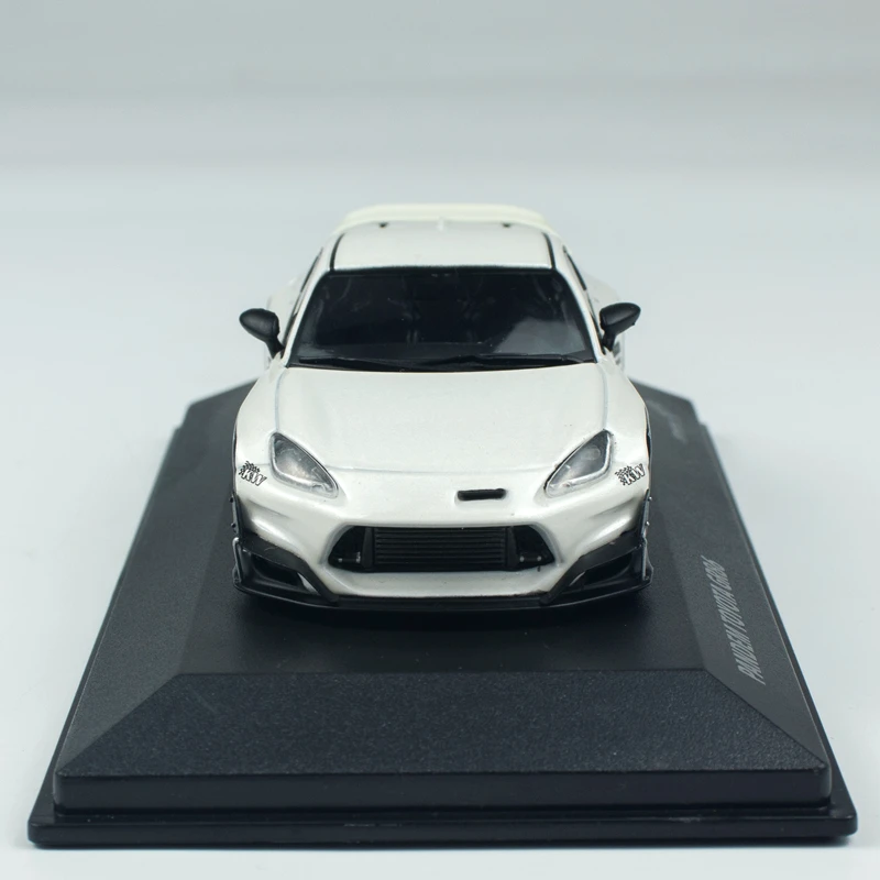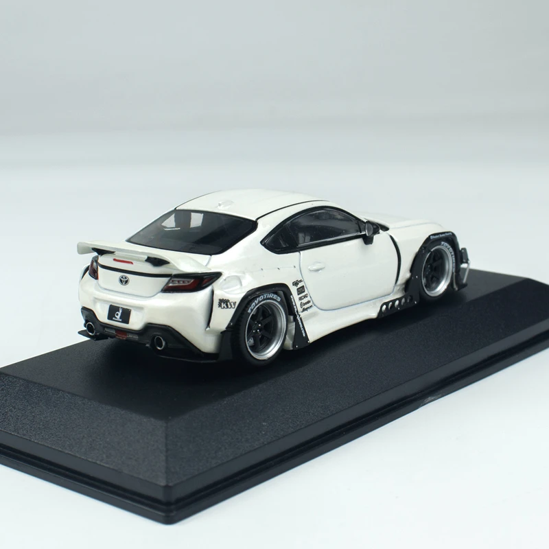Enhance your collection with this 1:43 scale diecast alloy car model of the Toyota GR86, crafted from durable metal with functional, turnable wheels. The sleek, aerodynamic design features a predominantly white body, contrasting black roof, glossy black tinted windows, and detailed front headlights, sculpted bumper, and tail lights for realism. The sporty stance is accentuated by a prominent rear spoiler, black-rimmed wheels with branded tires, and racing decals along the sides and rear. Perfect for hobbyists and collectors aged 14+, this finely finished model is a high-quality ornament that conforms to safety standards, making it an excellent addition to any automotive collection.