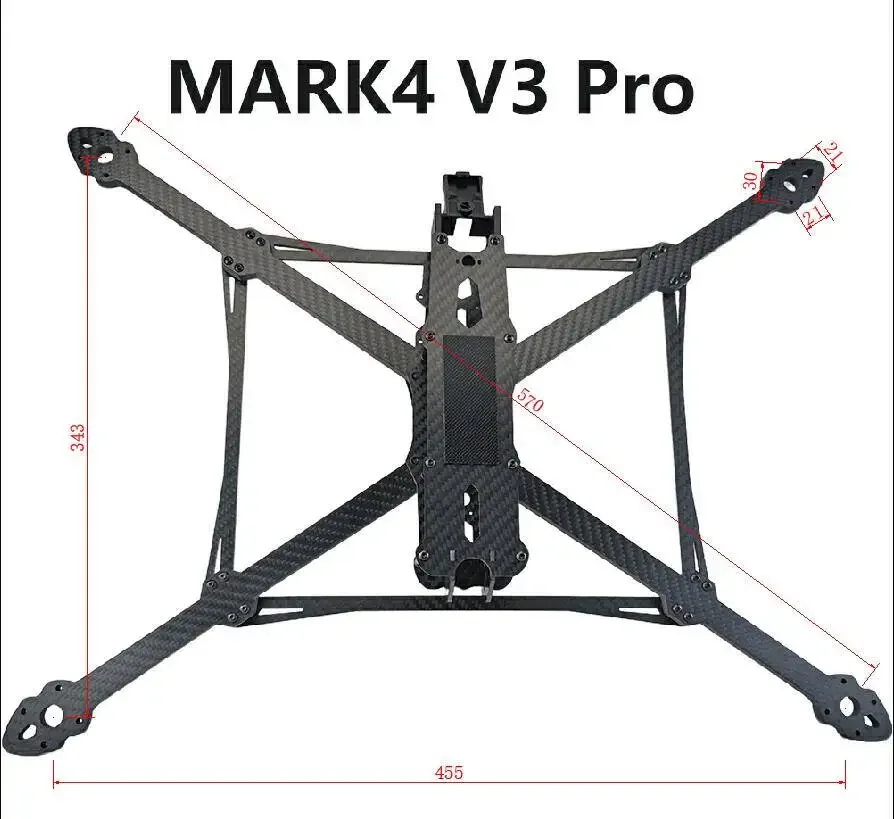 Experience the perfect blend of lightweight strength and modern design with this SoloGood 13-inch MARK4 V3 Pro carbon fiber frame. Crafted from high-quality black carbon fiber, it offers a sleek, aerodynamic profile ideal for FPV freestyle RC racing drones. Its precise engineering features a 570mm wheelbase with tapered, rounded arms designed to improve stability and maneuverability during high-speed flights. The flat, rectangular main plate provides a durable foundation for all your components, complemented by reinforced edges for added longevity. Multiple mounting points—such as 20x20mm and 30.5×30.5mm for flight controllers, 21x21mm for motors, and 20x20mm or 30.5×30.5mm for VTX—ensure compatibility with various setups. This robust, high-tech frame is perfect for building your dream racing drone.