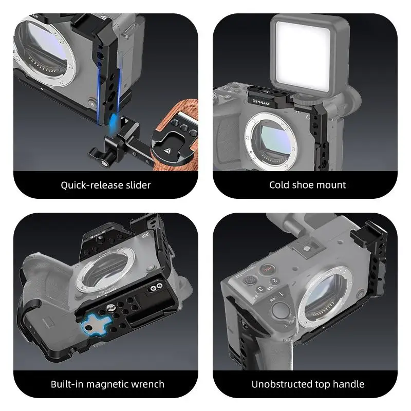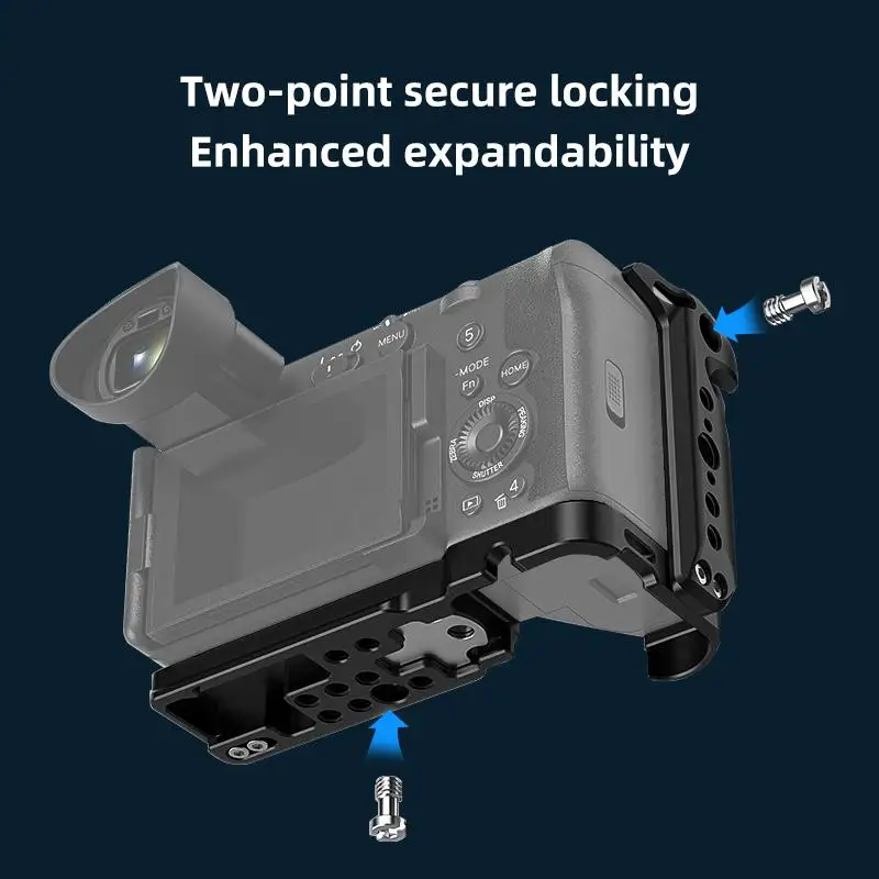 Crafted from aircraft-grade aluminum alloy, this lightweight Sony Cinema Line FX2 / ILME-FX2B camera cage offers a sleek, industrial design with precise, geometric holes and threaded mounting points. Its unobstructed, matte-finished frame ensures easy access to buttons, flip screen, and battery compartments, while multiple expansion ports facilitate attachment of monitors, microphones, tripods, and focus follow systems. The cage supports both horizontal and vertical shooting, featuring a built-in wrench for quick assembly and disassembly, providing a durable and versatile solution for professional videographers seeking a reliable, high-performance rig.