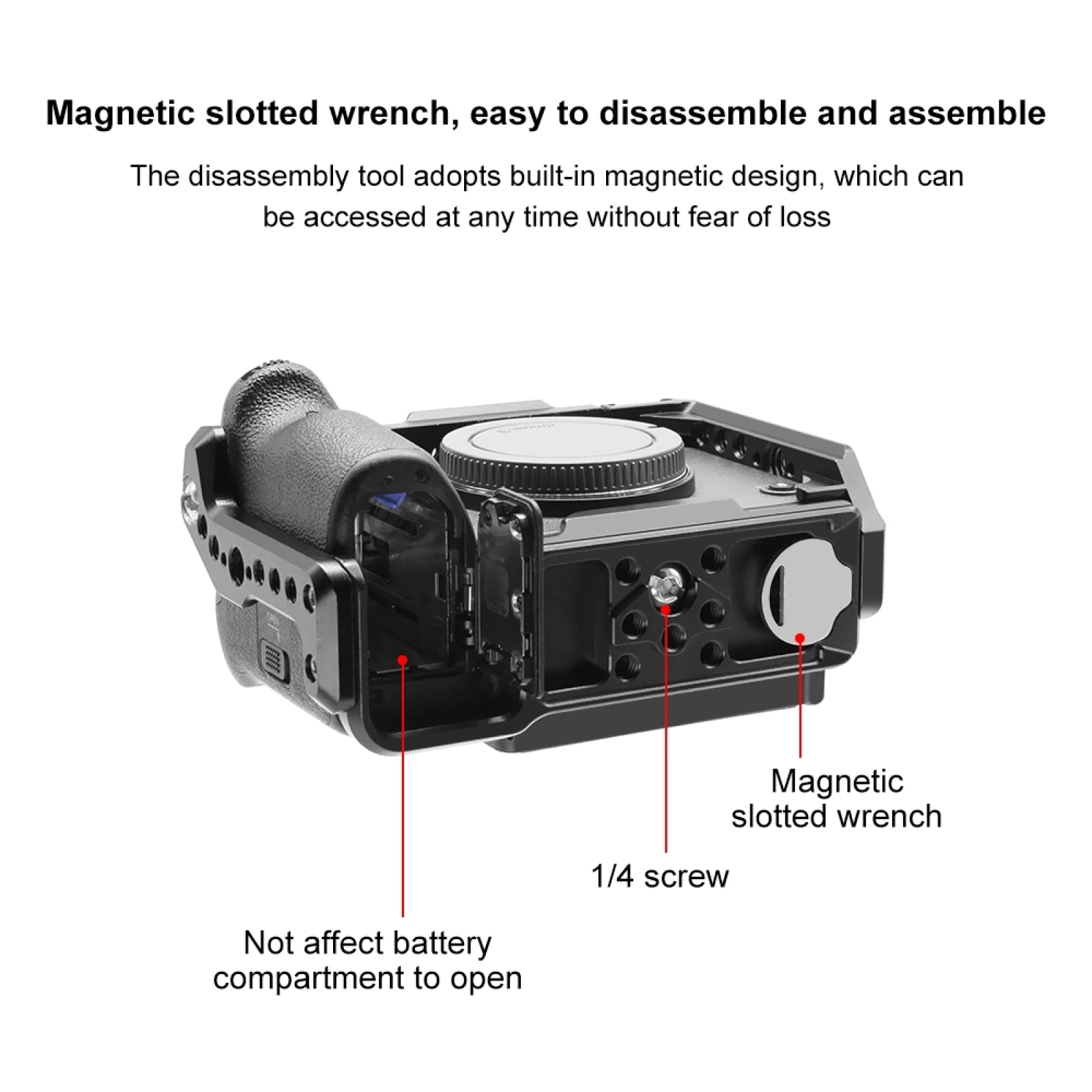 - Modular design with a top slider module secured by two 1/4 inch-20 screws, adjustable for compatibility with the original XLR handle after disassembly, enhancing stabilizing capabilities.