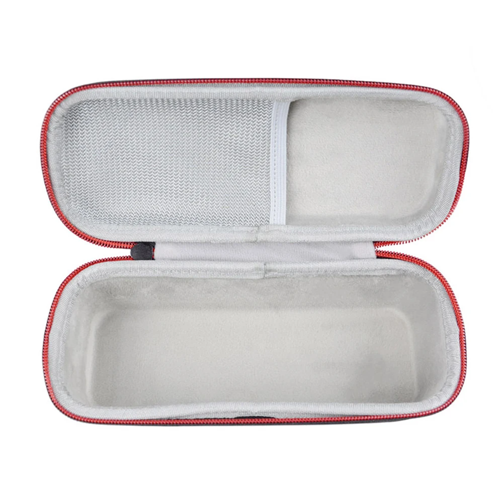 This protective carrying case for the Sony SRS-XB21 Bluetooth speaker offers a perfect blend of durability and style. Crafted from waterproof EVA+PU material, it features a sleek black exterior with red accents on the zipper, giving it a modern and rugged appearance. The hard outer shell ensures maximum protection against scratches, dents, and impacts during transport. Inside, a soft, textured, and padded slot snugly cradles the speaker, preventing scratches and adding anti-knock security. The case is lightweight at only 150 grams, making it easy to carry anywhere. It comes with an adjustable, comfortable hand strap with a sturdy buckle, allowing attachment to belts or larger bags for added convenience. Ideal for outdoor use, it combines practicality with a refined aesthetic.