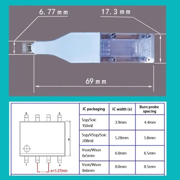 - Compatible with standard SOP8-150mil, SOC8-150mil, wide body SOP8-208mil, SOC8-208mil, and WSON 6×5, 8x6mm packages, ensuring versatility for various chips.