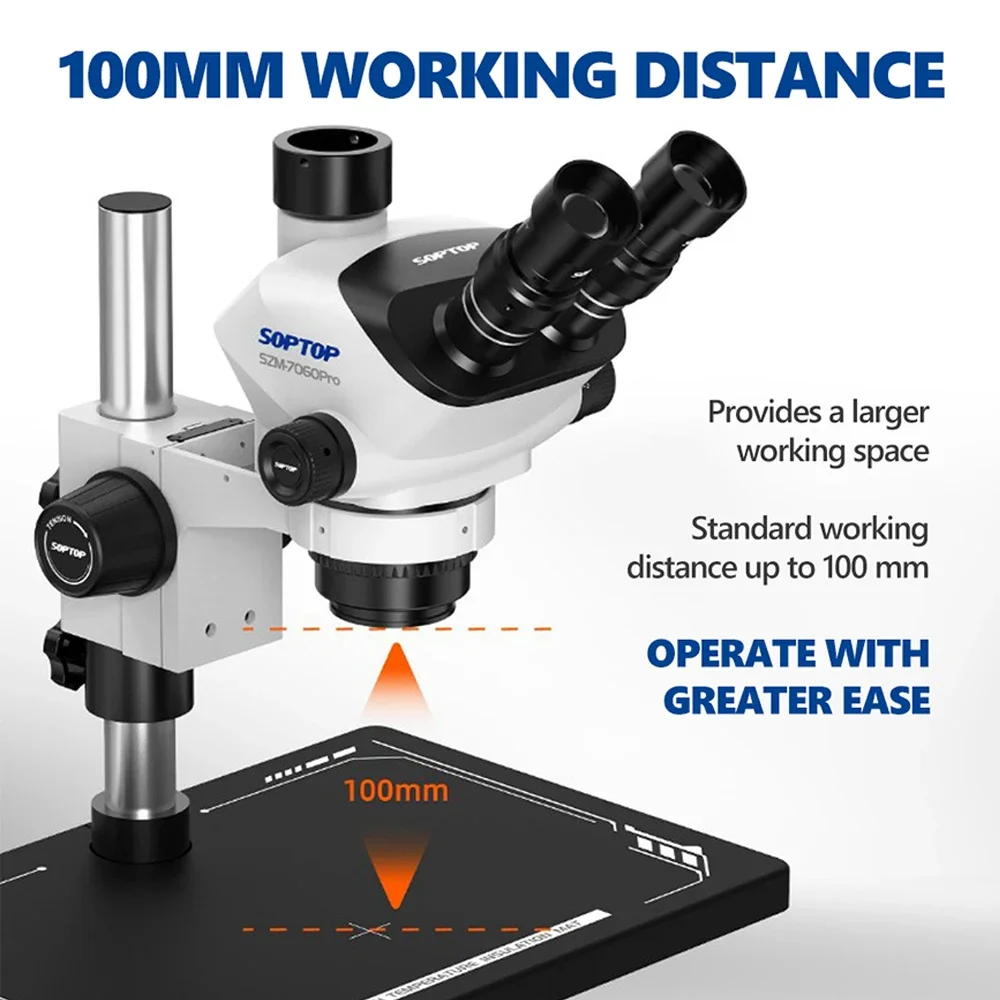 The SOPTOP SZM-7060PRO trinocular stereo microscope offers 4K HD imaging with a continuous zoom range of 7.0x to 60x and a 100mm working distance, ideal for detailed electronic repair and inspection. It features a single WF10X/22mm diopter eyepiece, all-coated copper objectives for sharp, accurate imaging, an adjustable high-brightness LED ring light, and a trinocular port supporting 4K output for external displays. The 45° ergonomic tilt stand with anti-slip and heat-resistant properties ensures comfortable use during extended tasks. Designed for precision and clarity, this sophisticated microscope makes inspecting tiny components, circuit boards, and solder joints effortless and reliable.