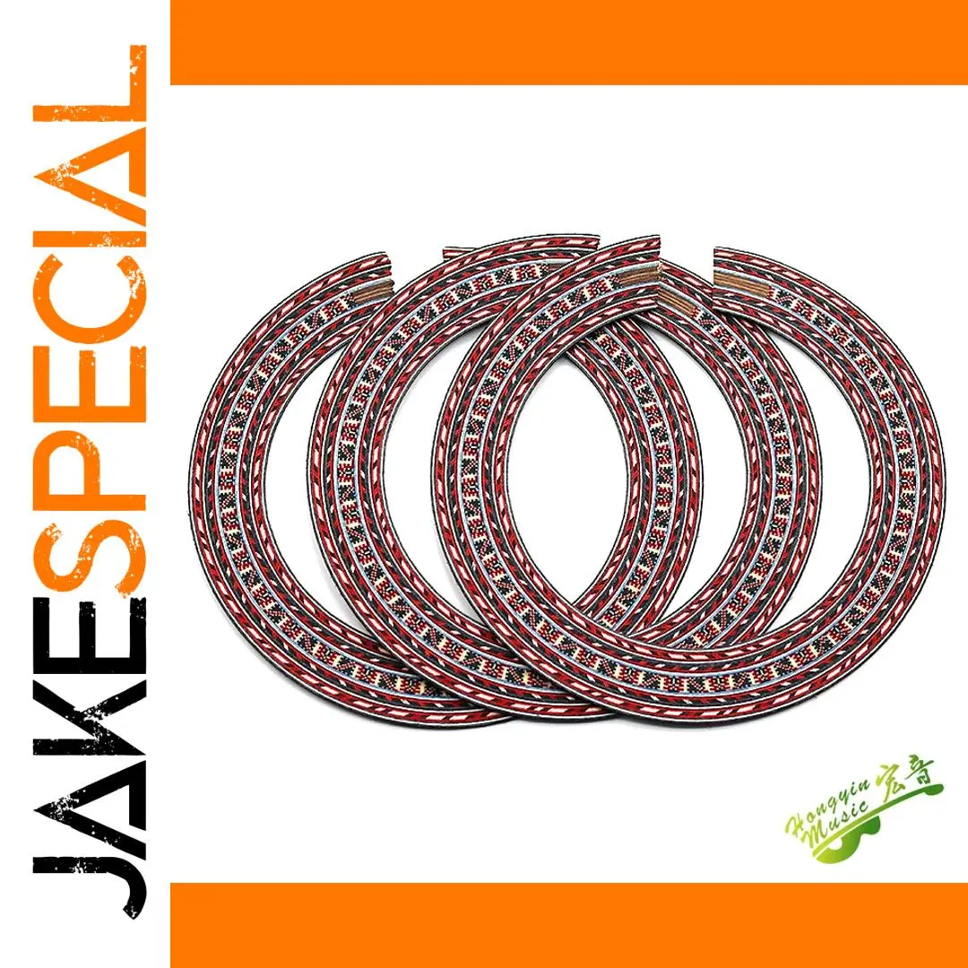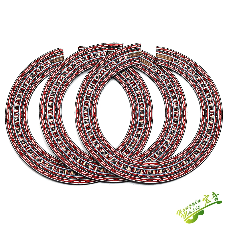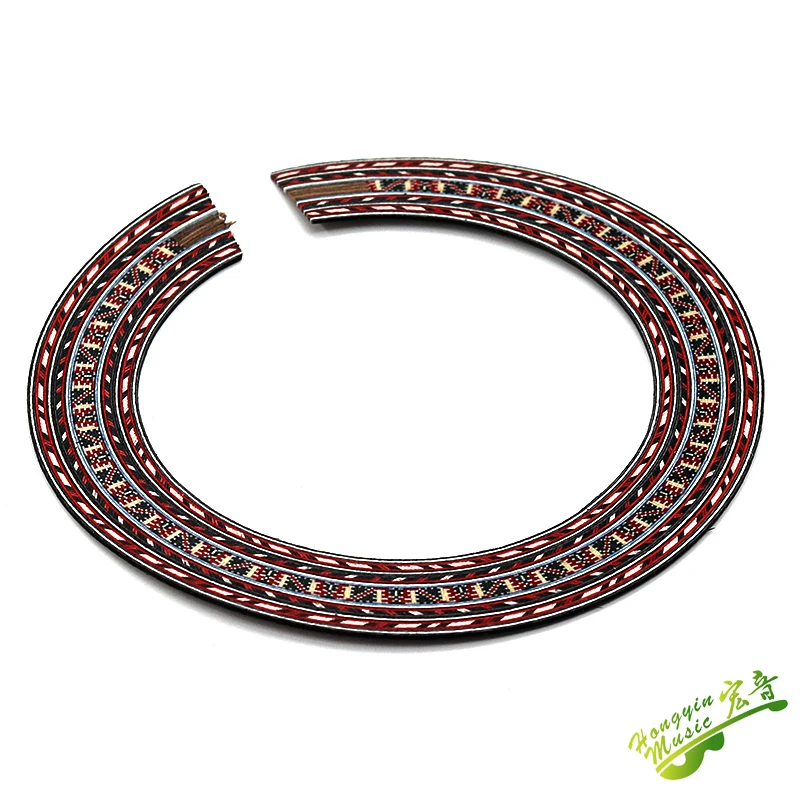 Transform your high-grade classical guitar with this exquisite set of three sound hole inlays, model YKQ93. Crafted from solid wood, mosaic, flower elements, and celluloid, these inlays showcase intricate craftsmanship and vibrant, bold colors including red, black, white, and hints of blue. Their unique geometric patterns and finely finished edges create a sophisticated, artistic touch that elevates the visual appeal of your instrument. Designed specifically for standard-sized sound holes, these inlays are perfect for guitar builders and luthiers seeking to add personalized decorative accents during construction. Not finished decorative pieces, they are intended for precise slotting and inlay work, ensuring a seamless integration into your guitar’s sound hole. These high-quality components promise durability and elegance, truly elevating the craftsmanship of your instrument.