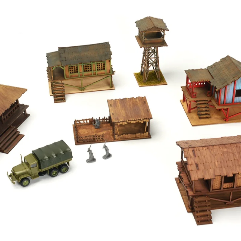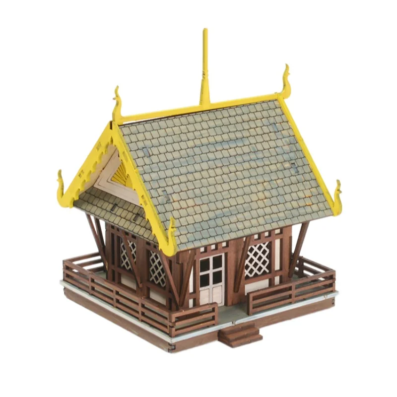 Imagine bringing a stunning, handcrafted Southeast Asian temple scene into your space. This 1/72 scale wooden model captures the intricate architectural details and vibrant cultural accents of a traditional temple. Crafted with precision from warm brown wood, it features a steeply pitched roof with weathered, multicolored tiles, and ornate yellow accents that beautifully highlight the upturned eaves and finials. The walls are designed with lattice panels and vertical supports, adding textured depth, while a small enclosed veranda surrounds the structure, enhancing its authentic charm. Perfect for display or educational purposes, this model invites you to enjoy its detailed craftsmanship and cultural richness in your home or office, creating a captivating miniature scene of Southeast Asian architecture.