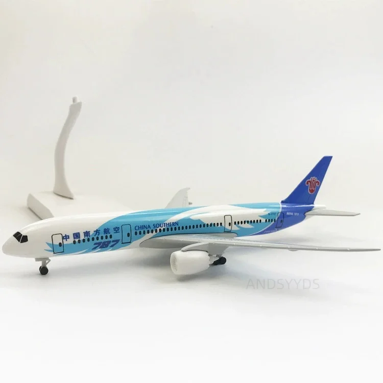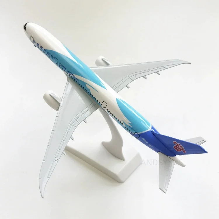 Experience the charm of aviation with this meticulously crafted 20cm scale model of a Southern Airways Boeing 787. Made from durable alloy and resin, this miniatures' sleek design captures the elegance of the original aircraft. The fuselage features a crisp white base with vibrant blue accents, complemented by detailed black cockpit windows and Chinese characters that add cultural flair. The striking tail fin displays a bold red emblem, bringing vibrant contrast to its modern style. With removable wings and landing gear, the model is designed for easy assembly, making it perfect for enthusiasts and collectors alike. Its smooth surface and detailed craftsmanship ensure it stands out as an eye-catching collectible or home décor piece.