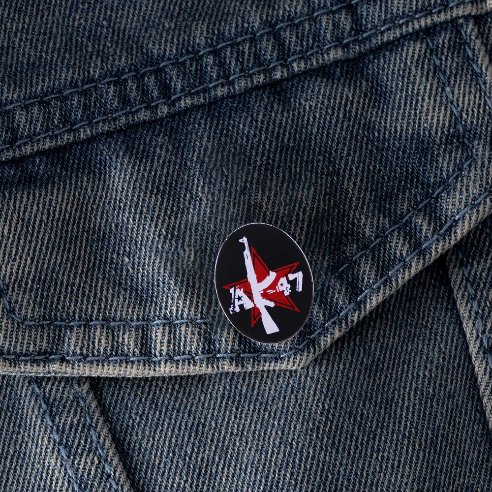 Imagine yourself making a bold statement with this eye-catching Soviet AK47 badge. Crafted from durable alloy, it measures 3 cm in diameter, perfect for adding a tough, rugged touch to your accessories. Featuring a striking red star backdrop and a white silhouette of the AK47 rifle, the badge exudes a military-inspired aesthetic with a punk edge. The distressed white characters “A” and “F” with the number “7” enhance its rebellious look. Its black background contrasts sharply with the vivid red and white design, creating a visually impactful piece. Designed for versatile use—on jackets, backpacks, hats, or DIY projects—it’s ideal for expressing your unique style while paying homage to bold, retro influences.