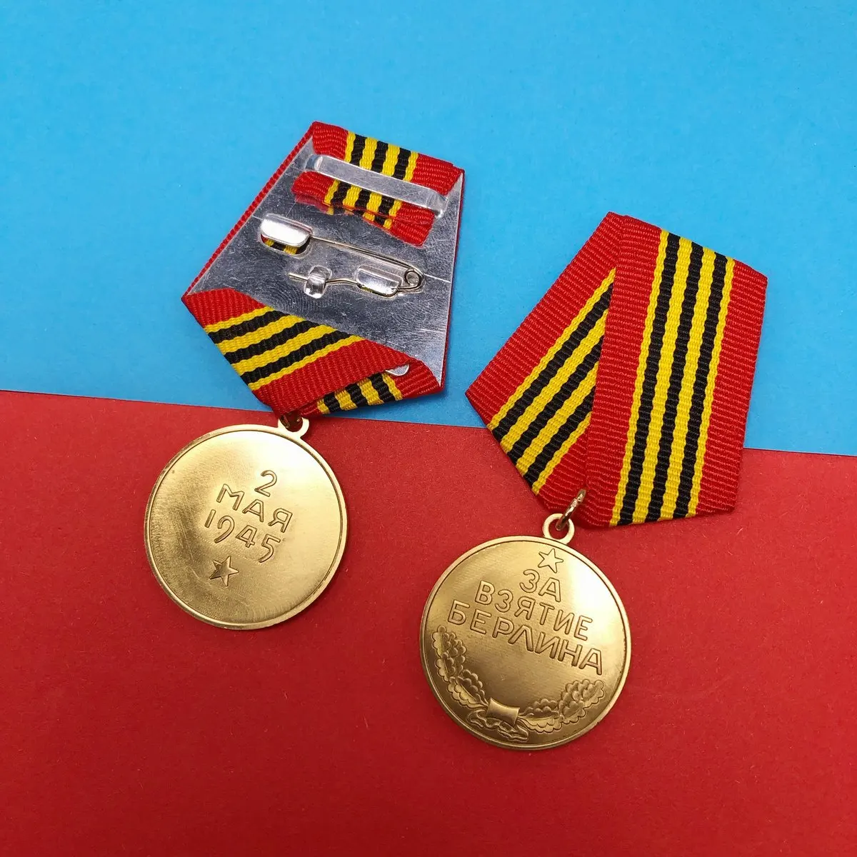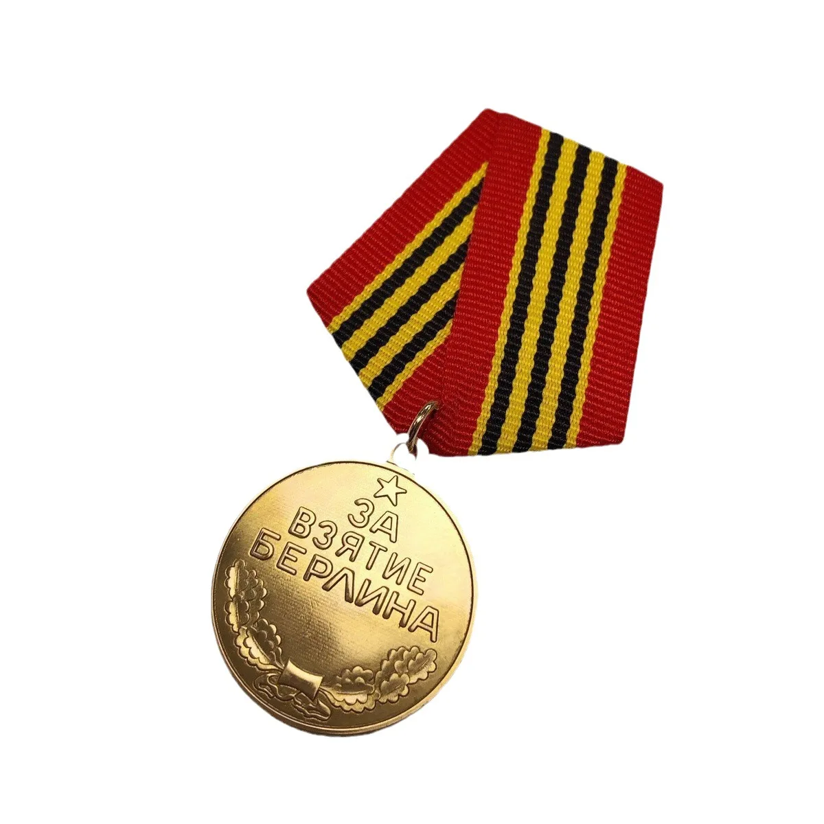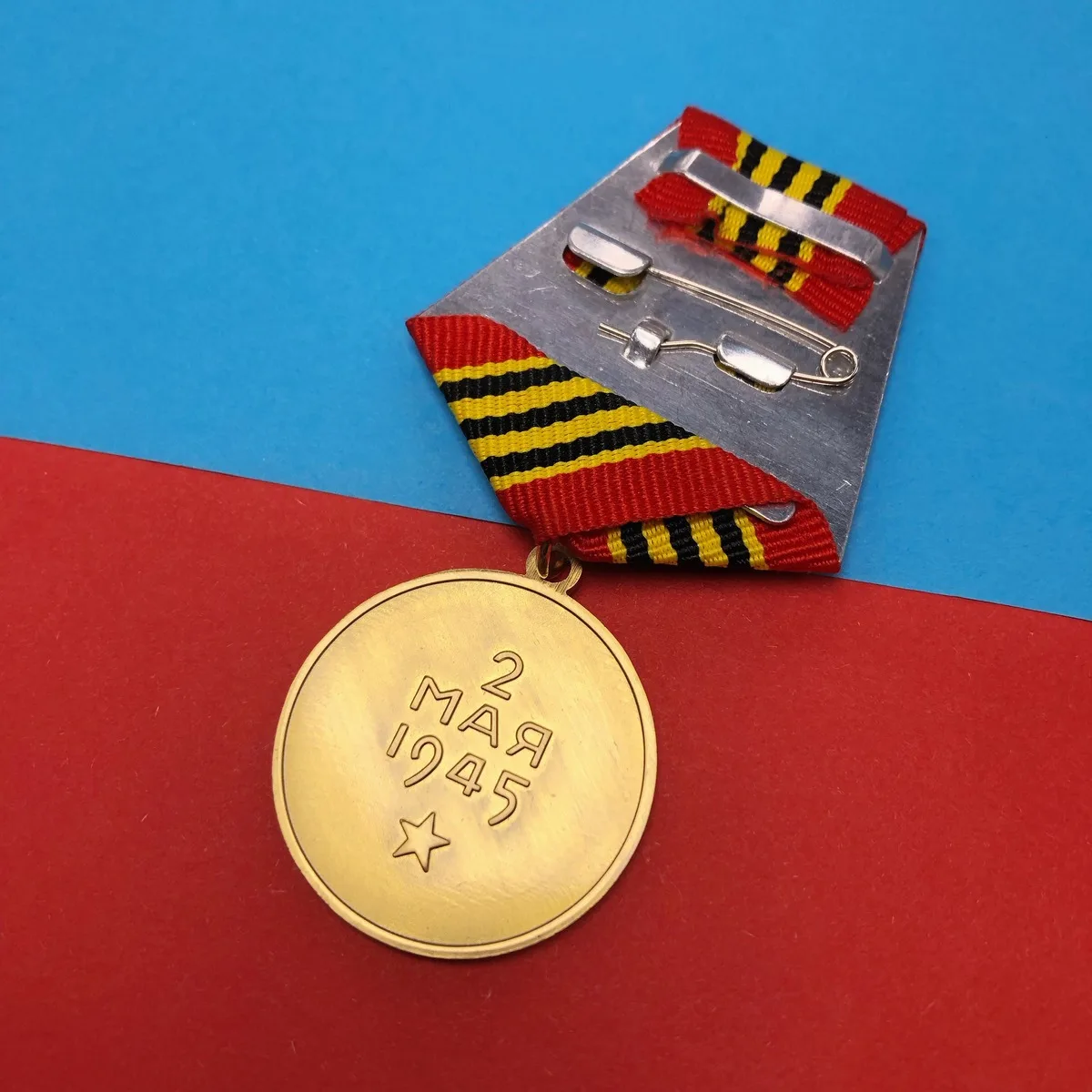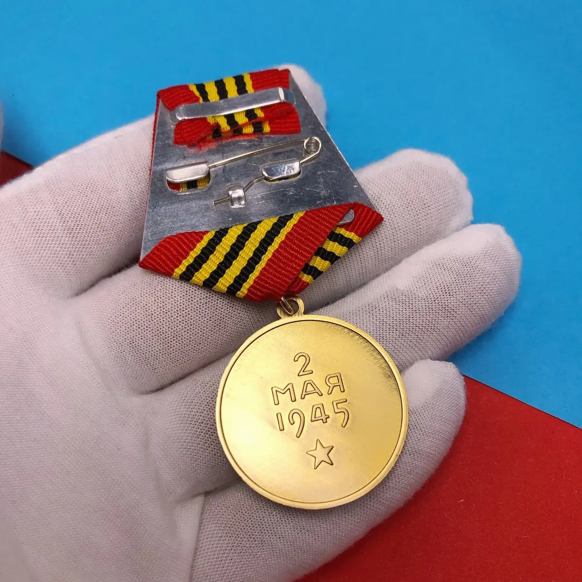 Imagine owning a piece of history with this stunning replica medal commemorating the Soviet victory in Berlin of 1945. Crafted with meticulous detail, this 32mm diameter medal features a shiny gold finish on a premium zinc alloy base, evoking the proud heritage of WWII. The front showcases the bold inscription “ЗА ВЗЯТИЕ БЕРЛИНА” (“For the Capture of Berlin”) along with a prominent star at the top, symbolizing patriotism. The reverse bears the significant date “2 МАЯ 1945,” emphasizing the historic victory. Paired with a vibrant striped silk moiré ribbon, this piece offers a nostalgic, vintage aesthetic that speaks to history enthusiasts and collectors alike. It’s the perfect tribute to a pivotal moment of global history.