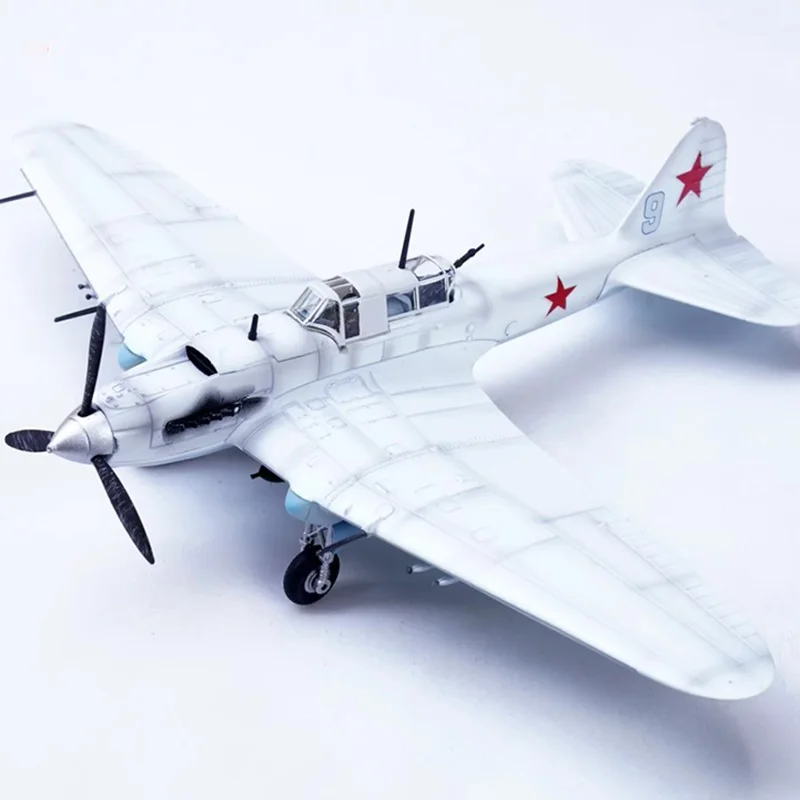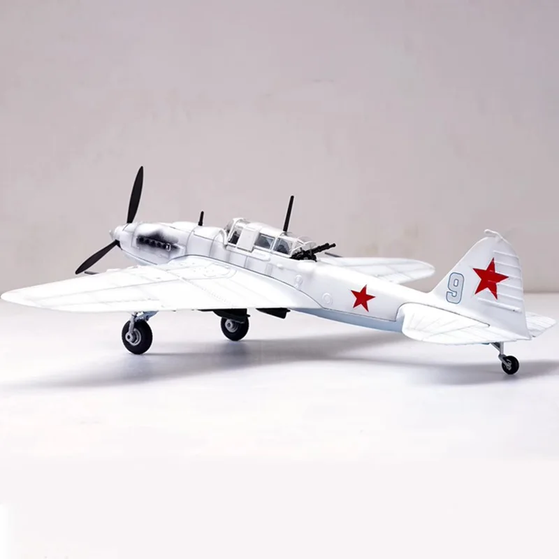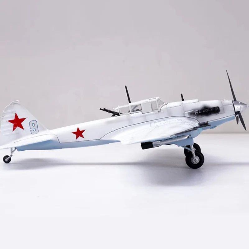 Experience the impressive presence of this meticulously crafted Soviet IL-2 aircraft model, scaled perfectly at 1/72. Made from high-quality alloy, it showcases a sleek, metallic finish that beautifully reflects light, capturing the essence of rugged military design. The exterior is predominantly white, contrasted by vivid red star insignias on both fuselage sides and the vertical tail fin. Subtle details, such as the gray number “9” on the tail, etched panel lines on the wings, and realistic gun barrels and exhaust outlets, highlight the craftsmanship. This model embodies the vintage appeal of the iconic aircraft, ideal for collectors or enthusiasts who appreciate precise, static display pieces that honor military aviation history. Its sturdy, alloy structure ensures durability and a luxurious appearance.