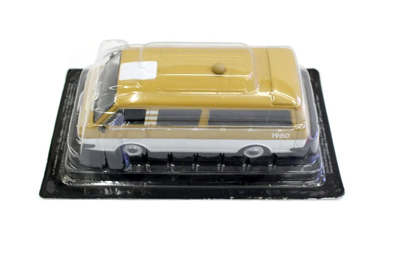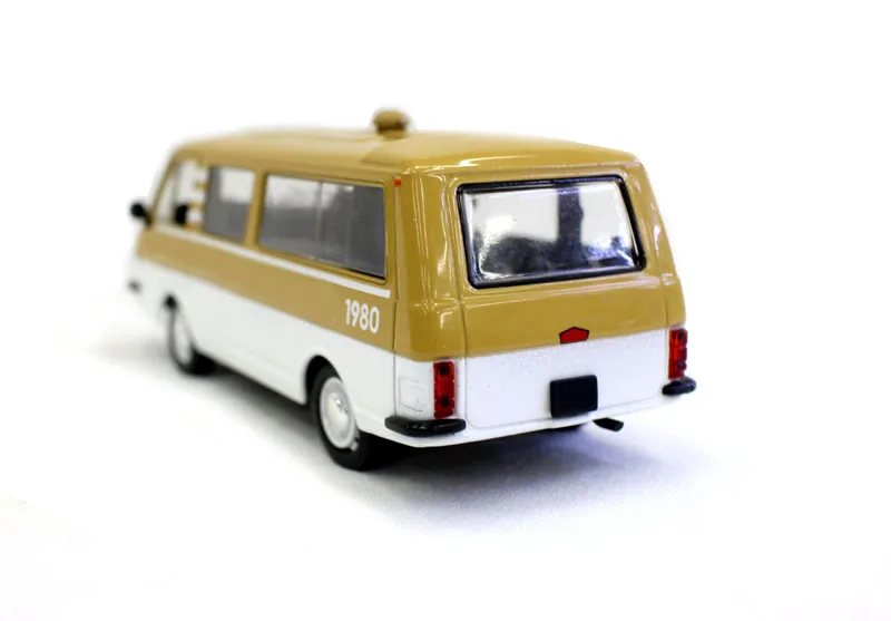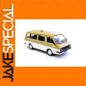 This meticulously crafted diecast model of the Soviet Union RA F 2203 Latvian van encapsulates vintage charm in stunning detail. With a striking color scheme featuring a light beige upper half and a glossy white lower section, it reflects the nostalgia of classic design. The year “1980” is prominently displayed in white lettering, serving as a focal point on its side. Its horizontal stripes in darker shades enhance the authentic, retro aesthetic, while tinted, detailed windows add to its allure. Measuring 10 cm in length, 4 cm in width, and 5 cm in height, this model is crafted from durable alloy and ABS plastic.
