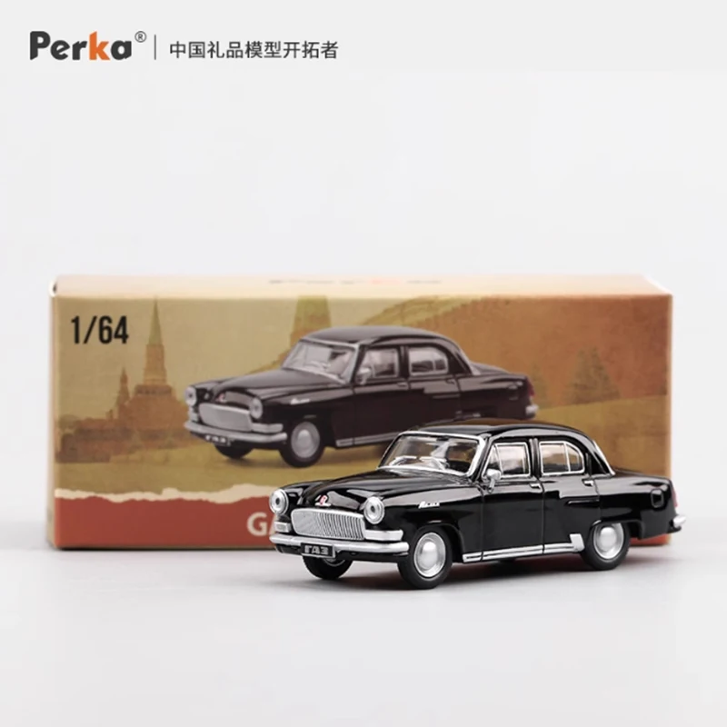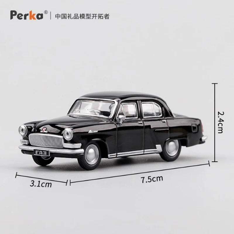 Experience the timeless elegance of this detailed diecast model of the Soviet M21 GAZ-21 Volga car, scaled perfectly at 1:64. Crafted from alloy and plastic, this miniature captures the iconic rounded sedan shape, seamlessly blending vintage charm with exquisite craftsmanship. Its glossy black finish makes it a striking display piece, highlighting the smooth metallic surface that reflects light beautifully. The model features transparent windows with sharply defined frames, and silver accents on the bumper, door handles, and side mirrors, providing a sophisticated contrast. Carefully detailed front grille, clear molded headlights, prominent taillights, and realistic silver wheels with molded tires complete its authentic vintage appearance—making it ideal for collectors and enthusiasts alike.