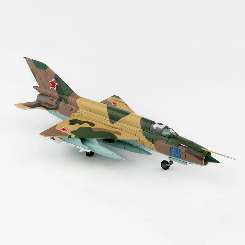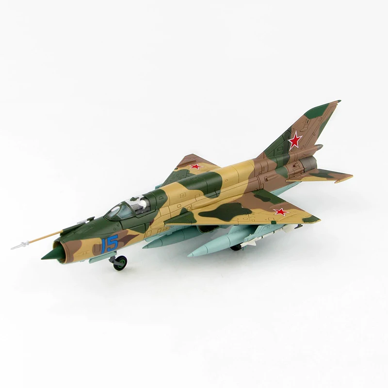 Enhance your collection with this detailed 1:72 scale diecast model of the Soviet Air Force MiG-21MT fighter jet, measuring 20×10 cm. Crafted from alloy and ABS plastic, it features a striking blue color scheme with realistic markings, including red star insignias on the wings and tail fin. The sleek, aerodynamic design captures the iconic delta wings and sharply pointed nose, complemented by finely crafted panel lines, heat exhaust grills, and transparent cockpit canopy. A slender yellow probe extends from the nose, and under the fuselage, light turquoise missiles or fuel tanks add authentic detail. Perfect for aviation enthusiasts and collectors.