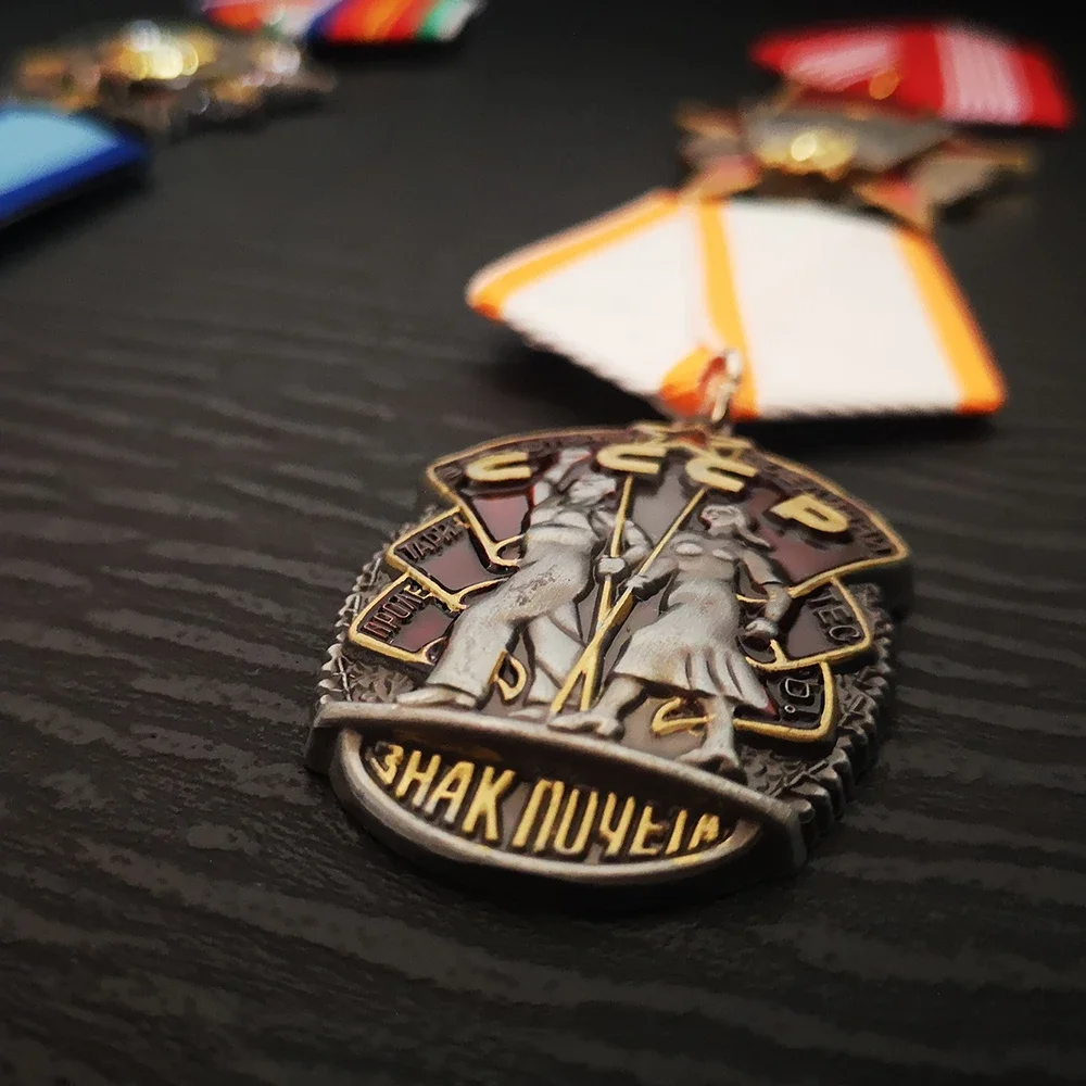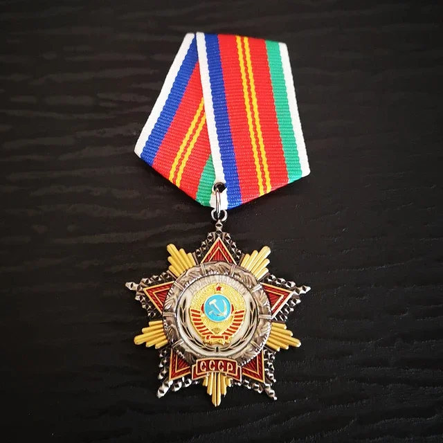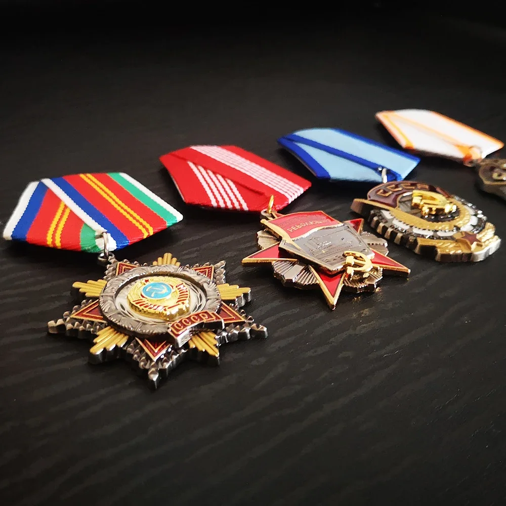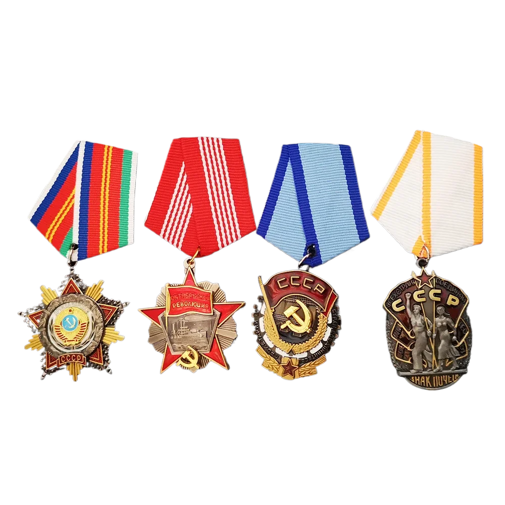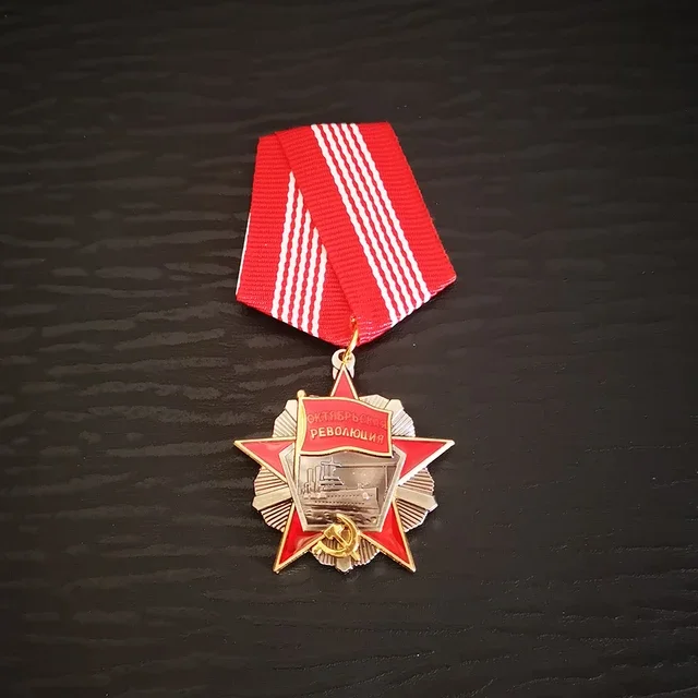 Step into history with this striking Soviet badge, a perfect collector's item to honor Russia’s revolutionary past. Crafted from durable metal, it features a modern design infused with patriotic symbolism. The badge showcases intricate details like a star shape with central emblems connected to the October Revolution, highlighted by gold and silver tones. Bright accents in red, blue, yellow, and green enhance its visual appeal. The ribbons, in vibrant striped patterns and solid hues—including red and white—add a dynamic touch. This nostalgic piece combines classic Soviet motifs with contemporary craftsmanship, making it an ideal accessory for vintage décor or commemorative collection. Picture yourself displaying this emblem proudly on clothing or as a highlight in your Soviet memorabilia collection.