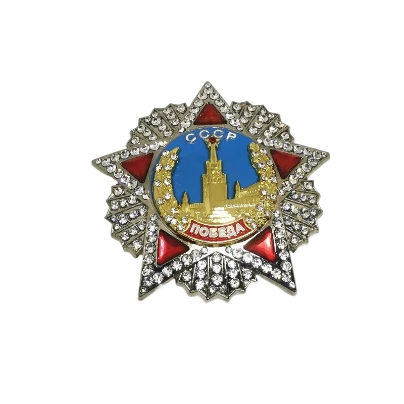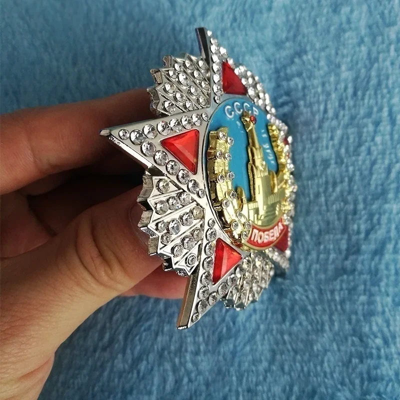 Imagine owning a striking piece of history with this detailed replica of the Soviet Order of Victory Medal. Measuring 7.6 centimeters in diameter and weighing approximately 50 grams, this alloy badge showcases a sophisticated design with intricate craftsmanship. Its prominent star-shaped form features a textured, silver-colored starburst decorated with clear rhinestones, creating a dazzling shimmer. Four bold red enamel triangles contrast sharply against the silver background, enhancing its visual impact. At the center, a circular blue enamel inset frames a detailed gold-tone depiction of a Soviet monument, adding a regal touch. Surrounding this are gold-tone inscriptions “CCCP” and “ПОБЕДА,” on a red enamel banner, symbolizing victory and pride. This high-quality copy will make a prized addition to any collection.