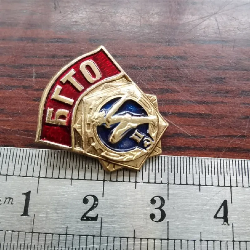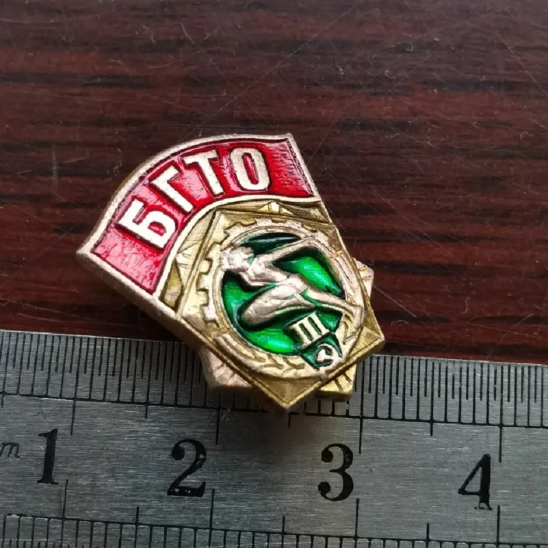 Celebrate the spirit of athleticism and patriotism with this intricately designed Soviet Union badge. Crafted from lightweight aluminum, it features a shield-shaped design with striking color contrasts. The deep blue background highlights the embossed figure of an athlete mid-performance, symbolizing dynamic movement and strength. Above, a vibrant red banner with Cyrillic “БГТО” in polished gold or brass adds a regal touch. Measuring about 3 centimeters in diameter, its European-inspired craftsmanship offers detailed contours and a polished finish, making it an ideal collector's item or patriotic accessory. This badge is durable, lightweight, and perfect for commemorative displays or personal collections that honor Soviet sporting achievements and national pride.