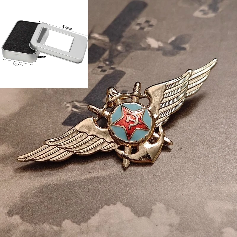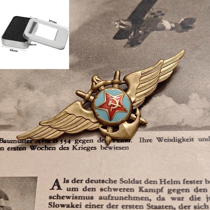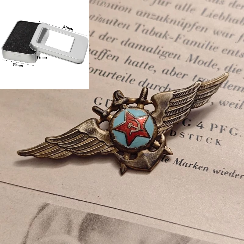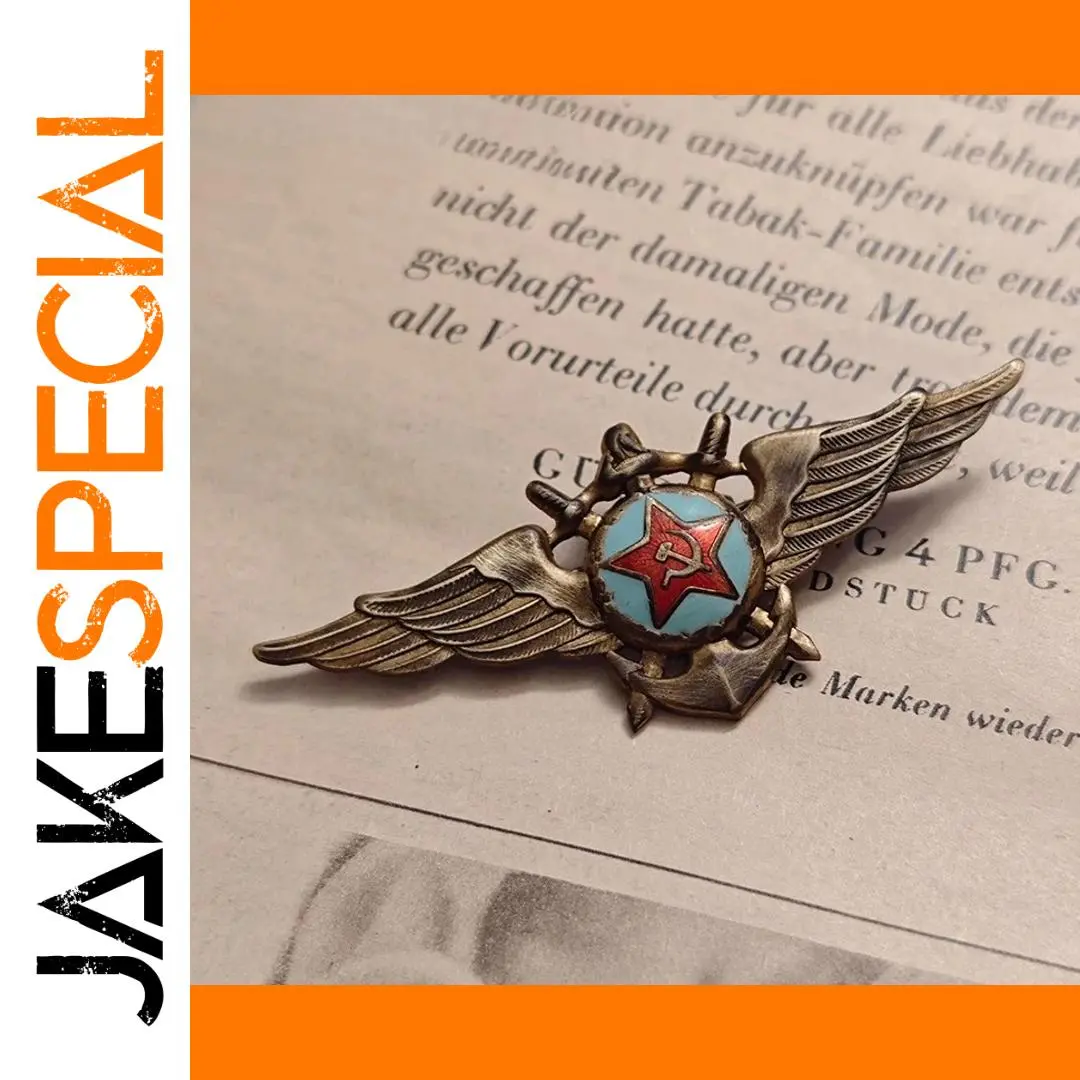 Step into history with this vintage-inspired Soviet Red Navy Pilot's Badge, designed for enthusiasts and collectors alike. The badge showcases an intricate, retro aesthetic with a brass or bronze finish that exudes aged charm. Its central circular motif features a vivid red five-pointed star with a hammer and sickle emblem, set against a soft light blue background. Encased in a textured, gear-like border, the badge is complemented by detailed metallic wings that extend horizontally, adorned with finely engraved feathers that suggest movement and aerodynamics. Crafted from durable metal and decorated with a vintage copper or light golden hue, this collectible piece embodies nostalgic craftsmanship and historical significance, making it a proud addition to any memorabilia display.