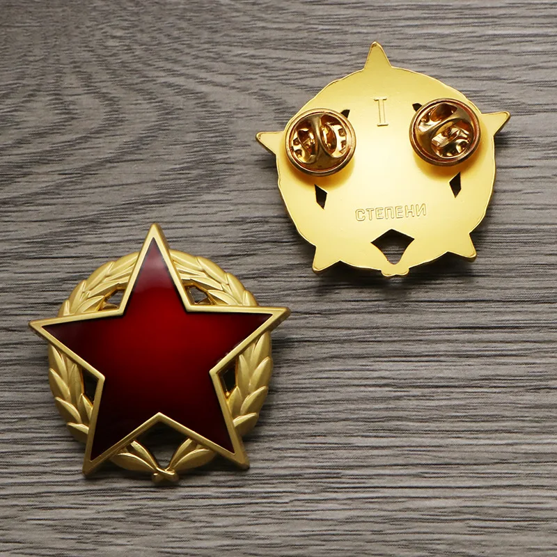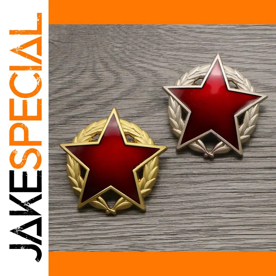 This vintage-inspired metal brooch showcases the Soviet Union’s Order of the Red Star associated with Yugoslav Partisans, available in silvery and golden tones. Its circular design features a glossy red enamel star outlined with fine metallic borders, encircled by a detailed, leaf-like wreath that is slightly raised, creating a three-dimensional effect. Reflecting a nostalgic, retro aesthetic, the brooch combines polished metallic finish with vibrant enamel accents, perfect for collectors or adding a touch of European historical style to your apparel. Crafted from metal with no concerning chemicals, this decorative piece offers customizable options for a unique, vintage accessory.