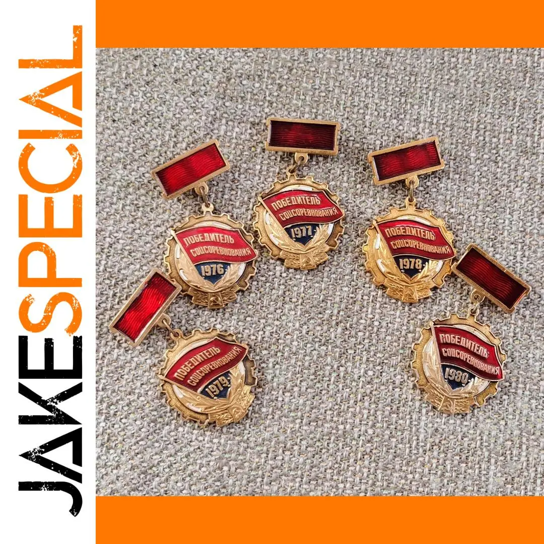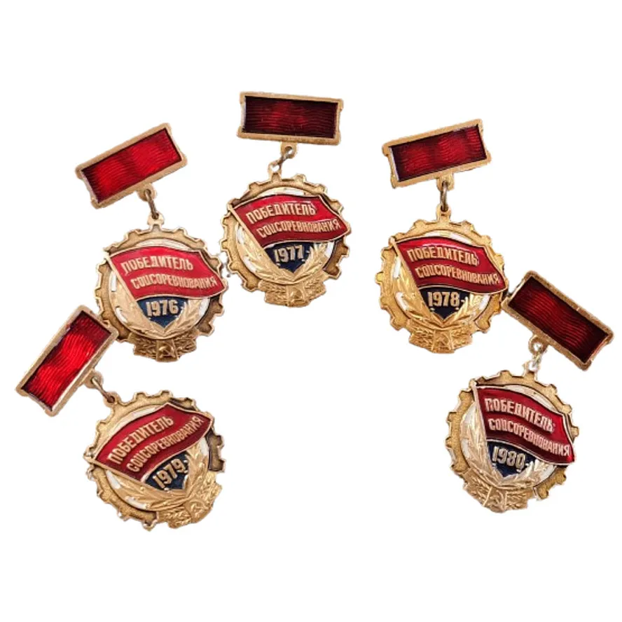 Celebrate your history with this striking set of Soviet Union labor competition medals from 1976 to 1980. Crafted from durable metal, each circular medal features a textured, gear-like outer edge that highlights craftsmanship and patriotism. The center showcases a shield-like motif with a vivid red banner displaying Cyrillic text, symbolizing victory and achievement. Dark blue segments with white or gold numerals indicate each year of recognition, creating a visual timeline of excellence. The medals are connected to rectangular bars painted in bold red with gold borders, adding a regal touch to their design. Their European style emphasizes a proud, historic aesthetic and makes a compelling display piece for collectors and enthusiasts alike. Visualize owning this historic collection that embodies dedication and national pride.