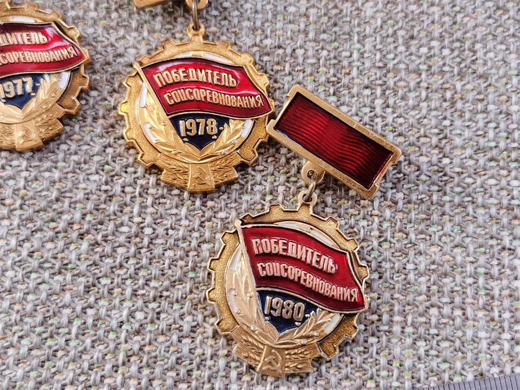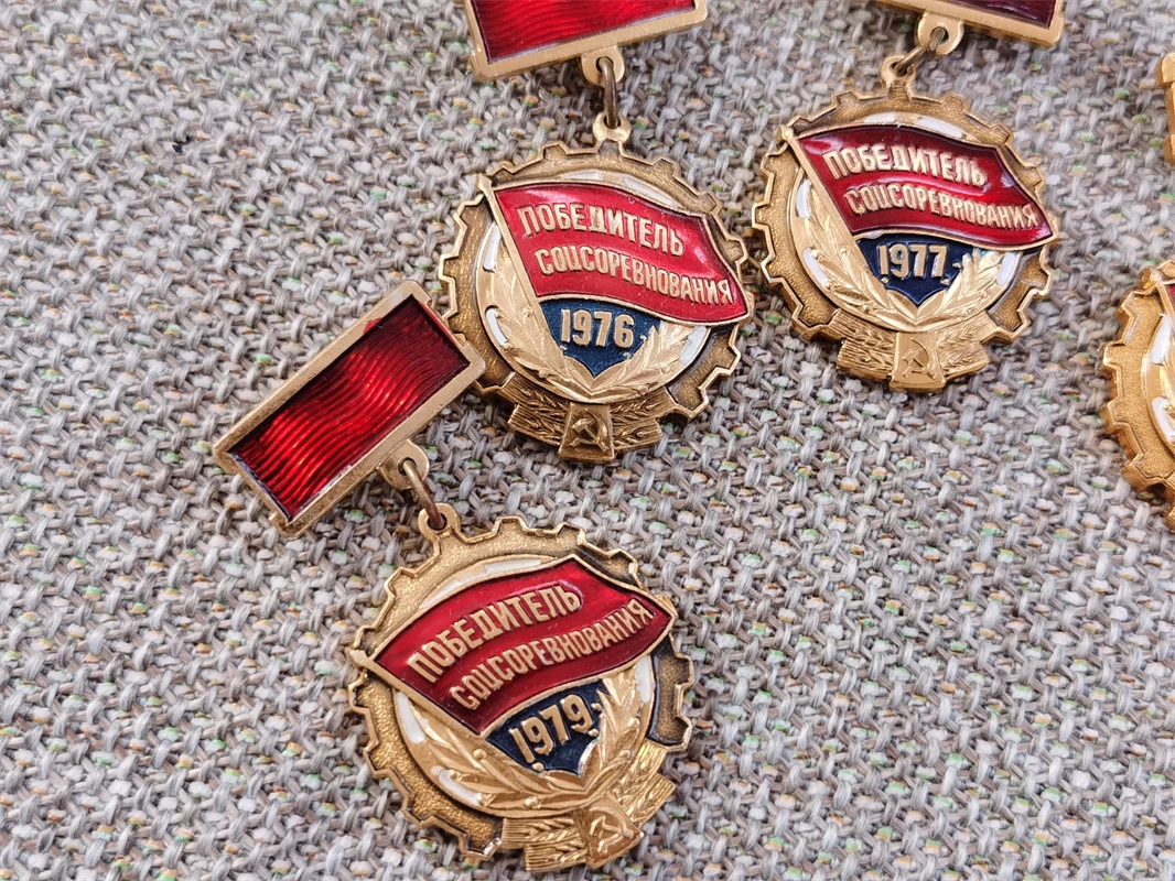 - Centered shield motif with a vibrant red enamel banner shows Cyrillic text “ПОБЕДИТЕЛЬ СОЦСОРЕВНОВАНИЯ” and highlights years 1976–1980 with white or gold numerals.