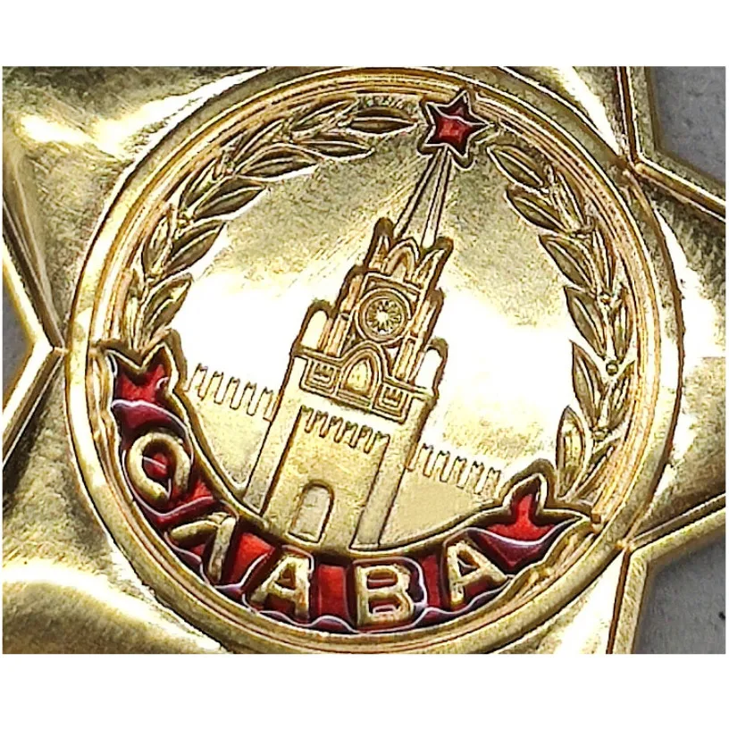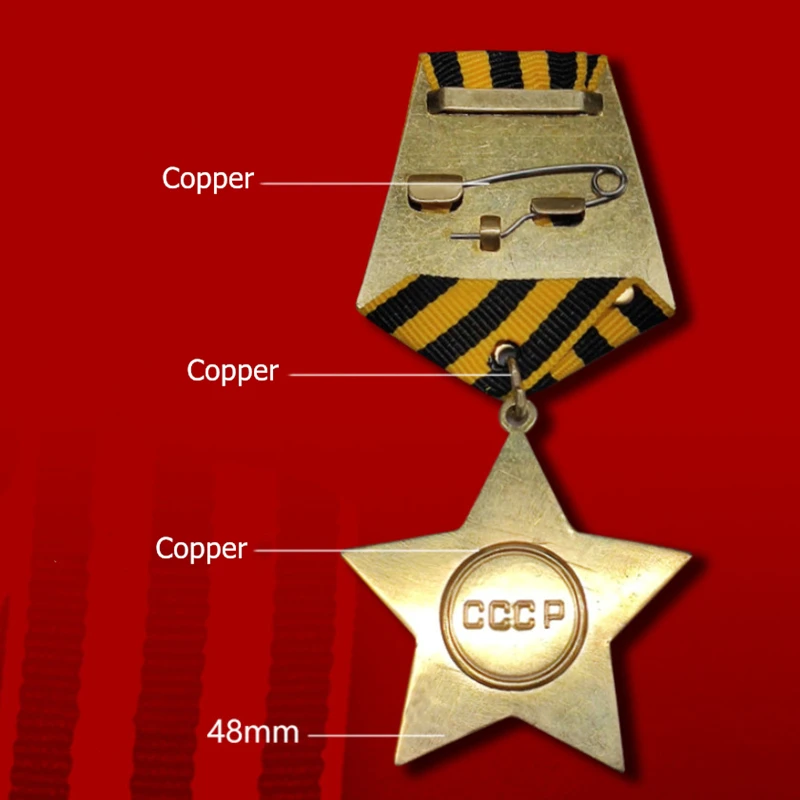 Celebrate Soviet history with this collectible badge featuring a polished copper five-pointed star and detailed emblem at its center, encircled by laurel leaves. The design boasts a vibrant red banner and star motif, symbolizing patriotism, set against a striking striped ribbon with bold black and gold vertical bands. Crafted using enamel and electroplating processes, this European-style item showcases intricate embossed details and a smooth, polished finish. Its durable copper base ensures a distinguished appearance, making it an ideal addition for collectors and enthusiasts interested in patriotic, historical memorabilia that evokes the grandeur of the Soviet Union’s legacy.
