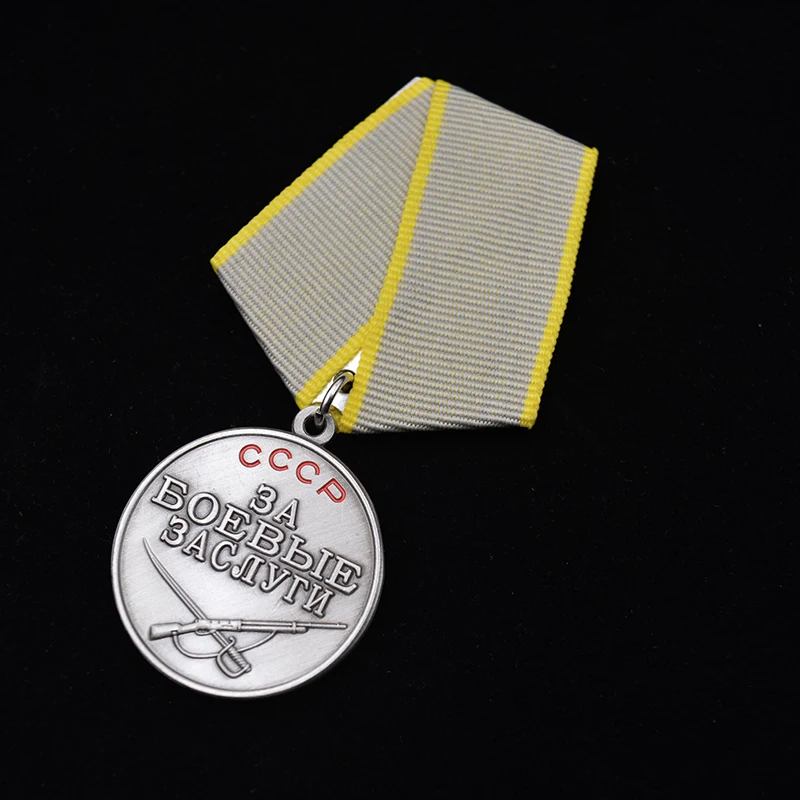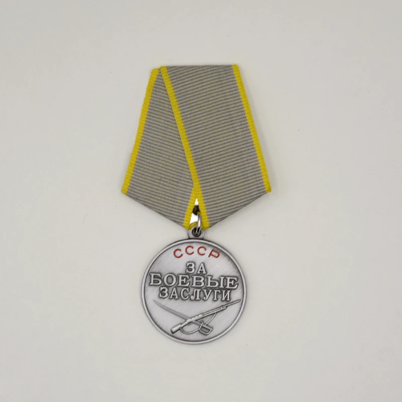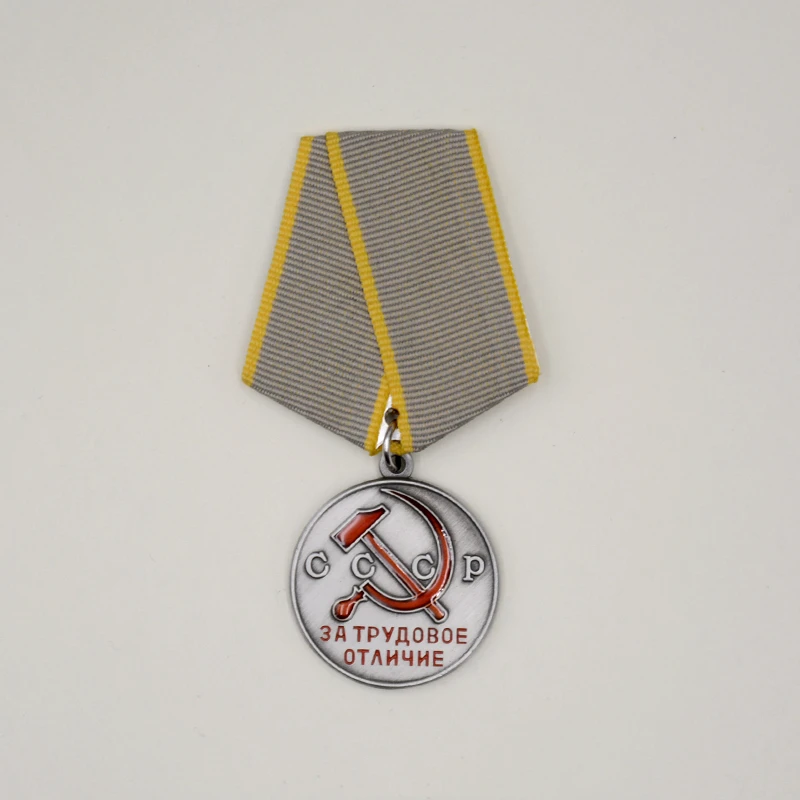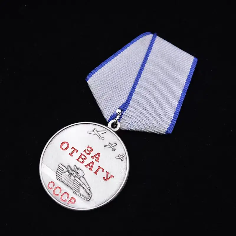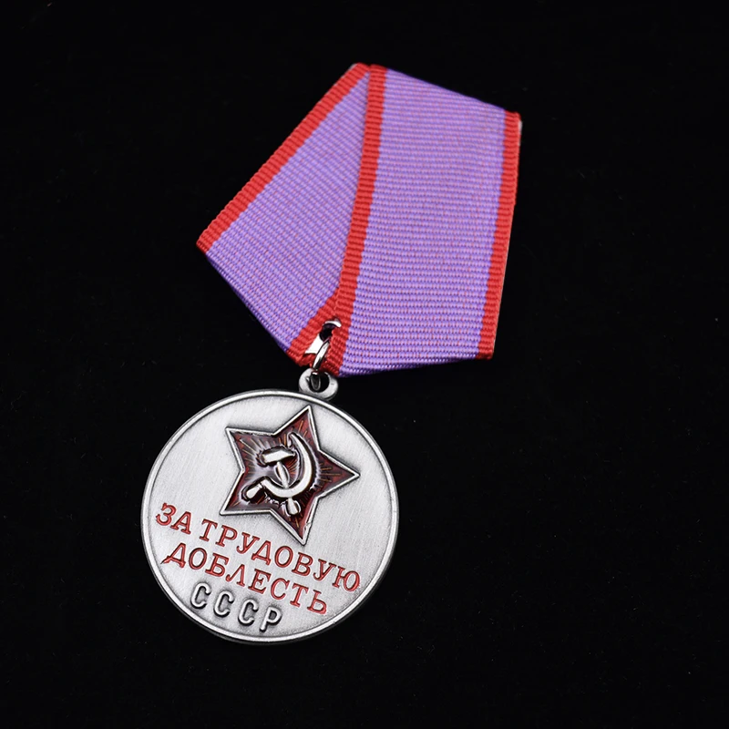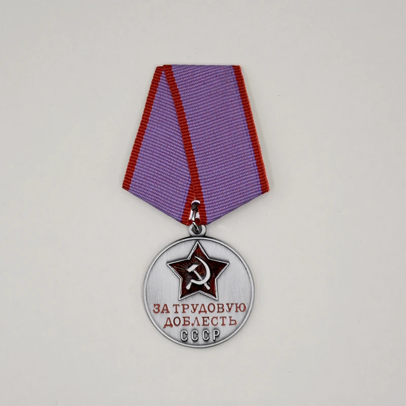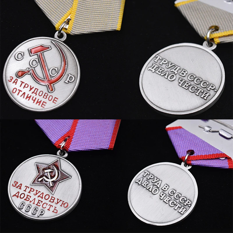 This set of four Soviet-themed medals features detailed alloy craftsmanship with sizes ranging from 29mm to 32mm in diameter, each symbolizing patriotism and valor. The Labor Heroic Medal (30mm) honors outstanding achievements across industry, agriculture, science, and culture. The Labor Excellence Medal (29mm) recognizes exceptional productivity and contributions in work and technology. The Brave Medal (32mm) celebrates personal courage in defending the socialist state, while the Warfare Medal (29mm) rewards active participation and promotion of military efforts. Each medal features intricate engraved symbols like tanks, crossed rifles, or the hammer and sickle star, attached to vividly colored ribbons such as white with blue edges, cream with yellow edges, and purple with red edges, making a striking display.
