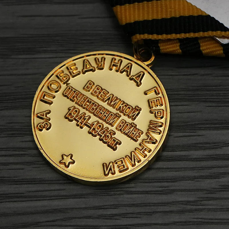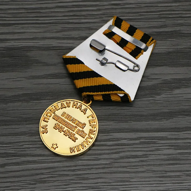 - Attached to a bold, diagonally striped black and yellow ribbon, which contrasts sharply against the gold medal for a striking visual effect.